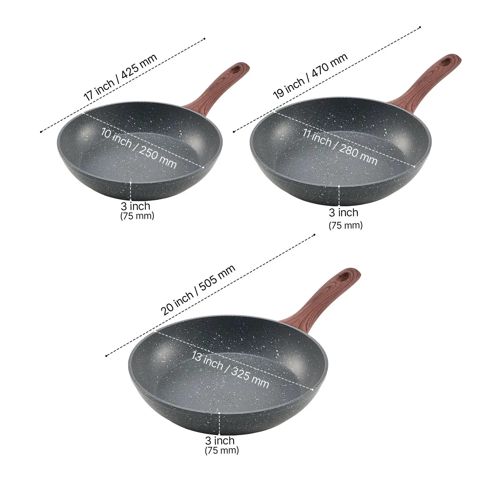 • Comfort Grip, Stays Cool: The aluminum skillet set features an ergonomic bakelite handle with heat guard, making it stay cool on the stovetop. Its water-transfer wood grain finish provides a stylish, real-wood look with a secure and comfortable grip