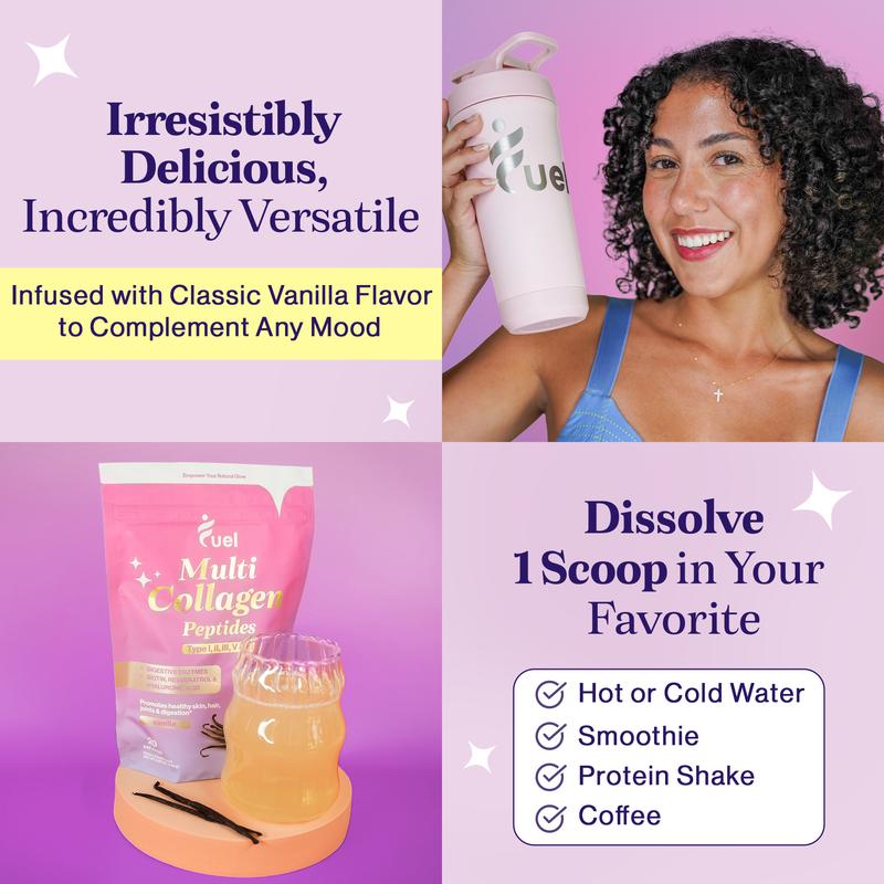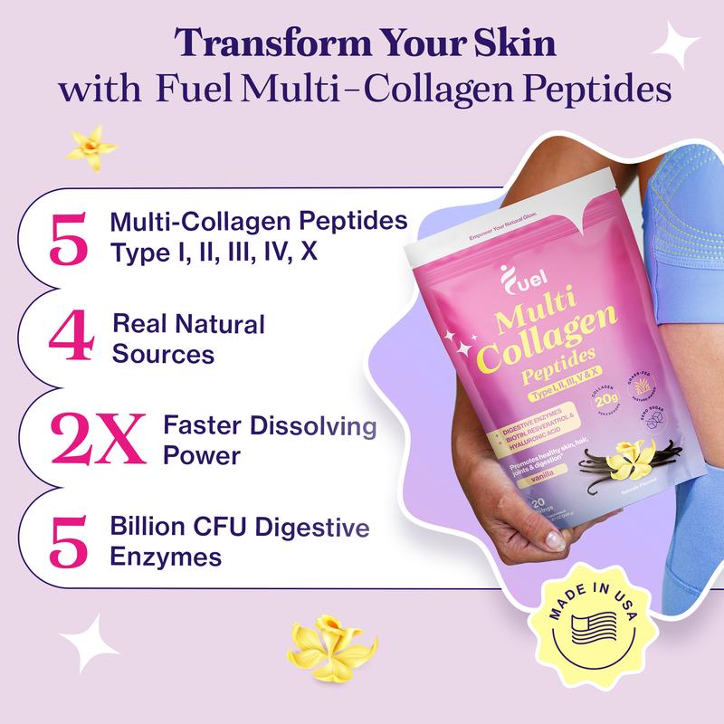 Get ready for radiant and glowing skin with Fuel Multi Collagen Peptides 11 ALL IN ONE SUPPLEMENT. A powerful flavored and unflavored multi-collagen complex that offers the most essential types of collagen including types I, II, III, V & X. Mix it into any of your favorite drinks. This beauty supplement is perfect for anyone looking to achieve youthful looking skin and healthy hair. Feel young again and maintain that healthy youth with Fuel complete beauty product. A health and household staple for both men and women.
