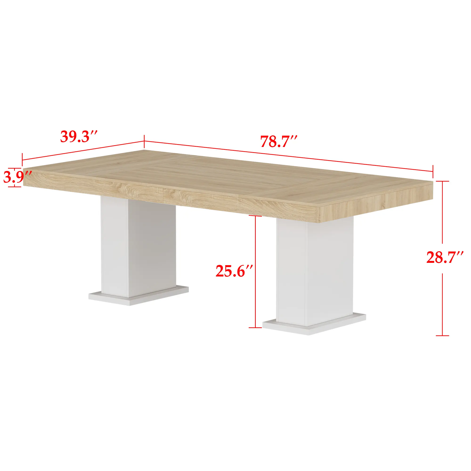 Size: 78.7”W x 39.3”D x 28.7”H. This modern farmhouse style table serves as a dining table and a desk. It's made from reliable wood, perfect for kitchens and restaurants. The desktop is composed of four 39.4" x 19.7" boards, with varying patterns. Desktop thickness is 3.9".