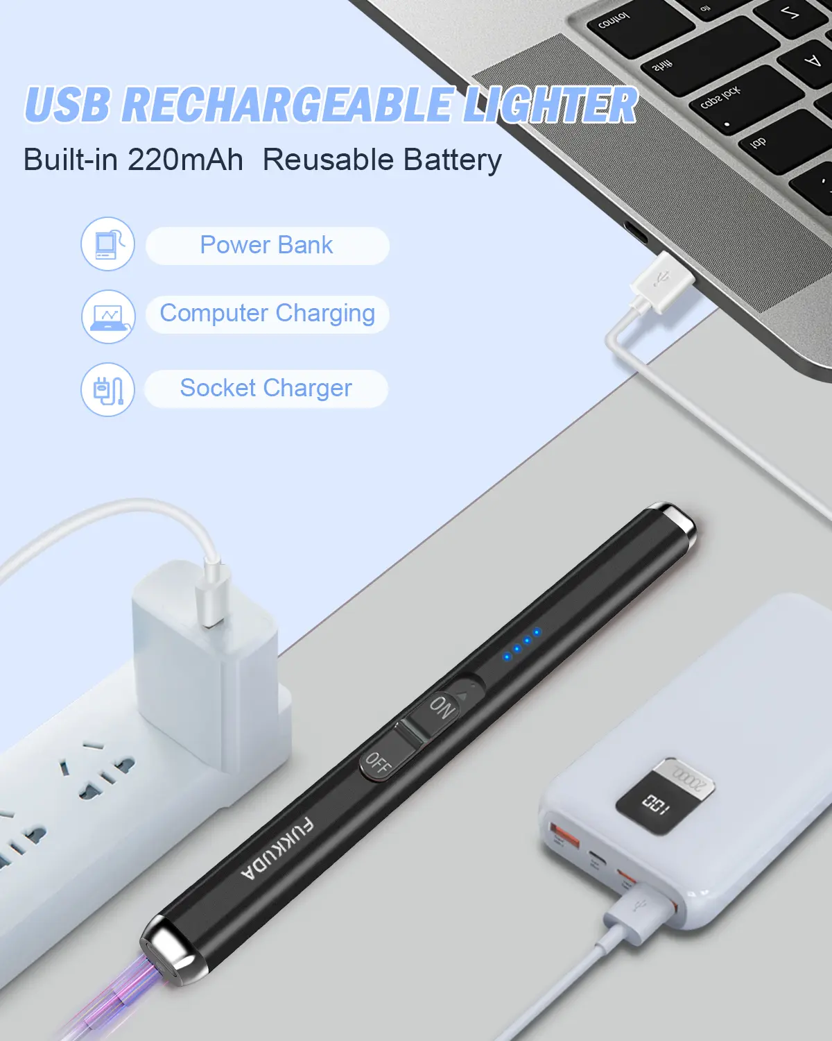 ·【USB Rechargeable Battery】- No need to refill the lighter ever with a built-in 220 mAh large capacity battery! The USB cable can connect to power sources such as socket, computers, power bank and etc. and the power indicator lights can show you the real-time power level. (The indicator lights will turn off after fully charged)