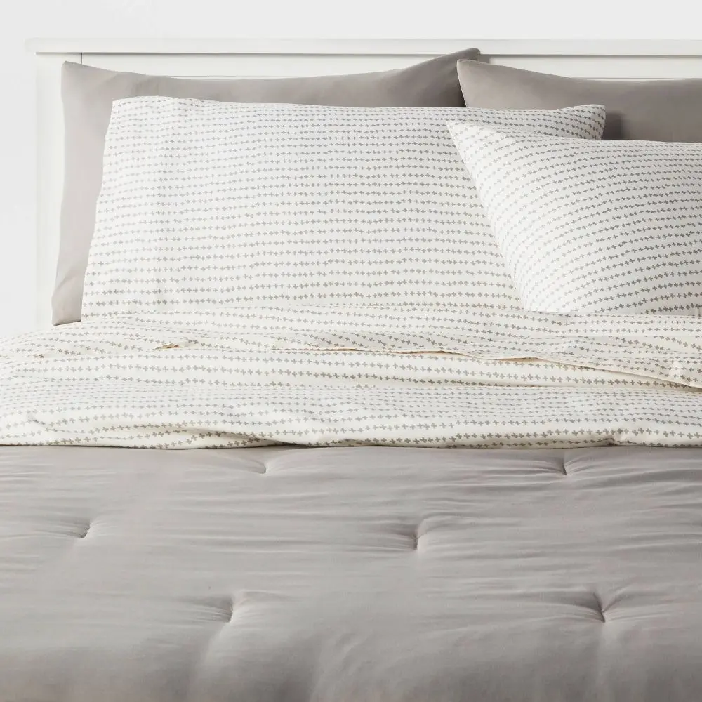 Give an elegant update to your bedroom ensemble with this Solid Microfiber Comforter & Sheets Set from Room Essentials. The comforter features patterned stripes on a white background that reverses to a solid color on the other side, making for a striking and easy-to-switch-up look that's perfect for any bedroom decor. The five-piece bedding set also includes a flat sheet and fitted sheet with coordinating stripes, along with a matching pillowcase and pillow sham with stripes or a solid-color design.