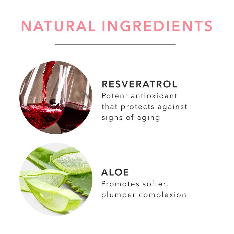 IngredientsAloe Barbadensis Leaf (Organic Aloe Juice)*, Rice Starch, Extracts of Prunus Persica (Peach) Fruit, Prunus Armeniaca (Apricot) Fruit, Daucus Carota (Carrot) Sativa Root Punica Granatum (Pomegranate), Theobroma Cacao (Cocoa Bean) and Solanum Lycopersicum (Tomato) Fruit/Leaf/Stem, Zinc Oxide, Plant Cellulose, Coffee Bean, Sunflower Lecithin, Euterpe Oleracea Pulp (Acai) Oil, Punica Granatum (Pomegranate) Seed Oil, Resveratrol (Red Wine Resveratrol), Alpha Lipoic Acid, Tocopherol (Vitamin E), Camel