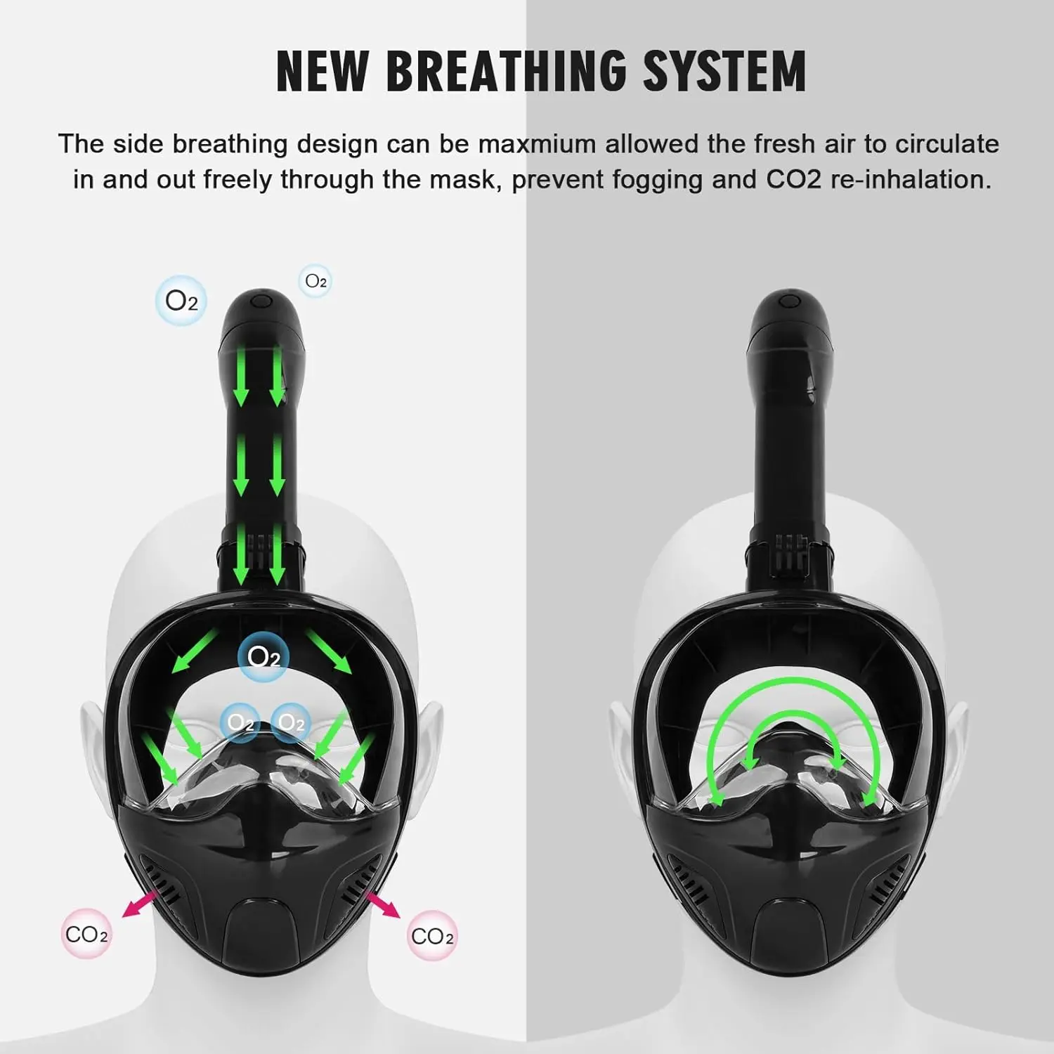 The entire respiratory system of the mask ensures maximum oxygen supply through the intake port, while the exhalation ports on both sides of the mask effectively prevent the re-inhalation of CO₂. When snorkeling, fresh air enters the mask from the top, separated from the CO₂ in the viewing chamber, and exhaled CO₂ is expelled from the sides of the mask. You won't feel dizzy or suffocated from inhaling a CO₂-air mixture, maximizing safety.