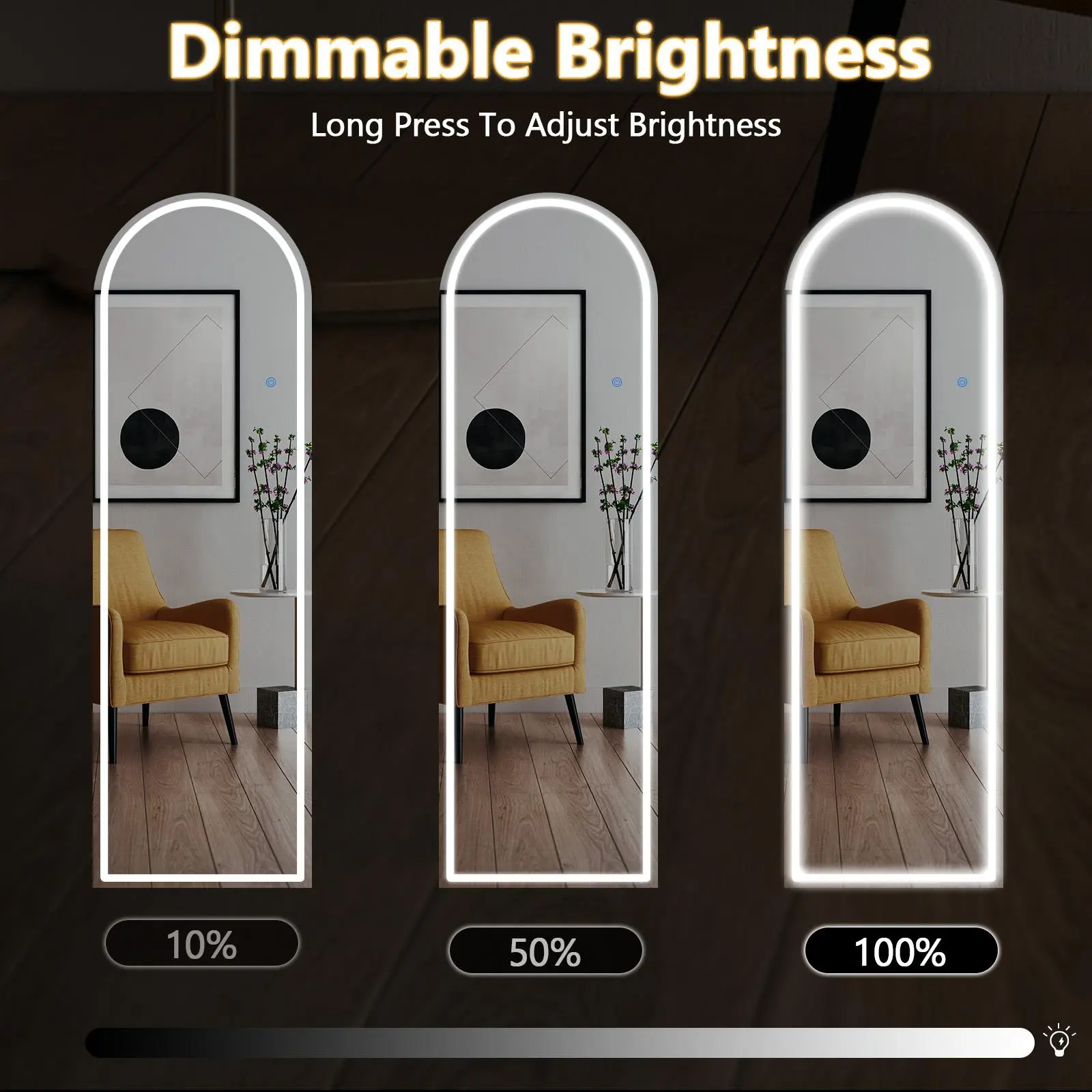 3 COLOR & ADJUST BRIGHTNESS:The brightness and light temperature of this mirror are controlled by smart touch buttons. A short press on the touch switch adjusts the color temperature to white, warm and yellow light. A long press on the switch for a few seconds adjusts the brightness to your preferred level.