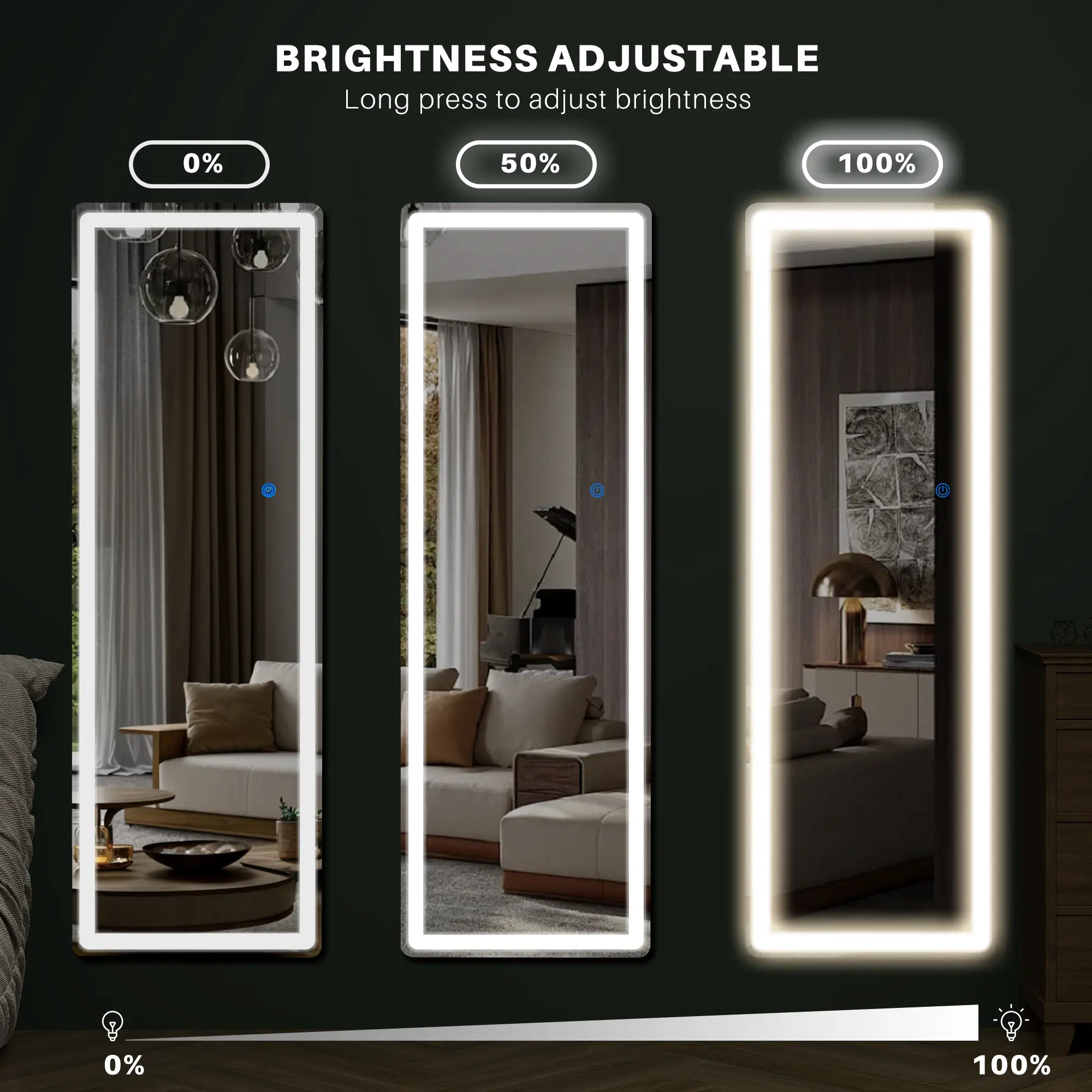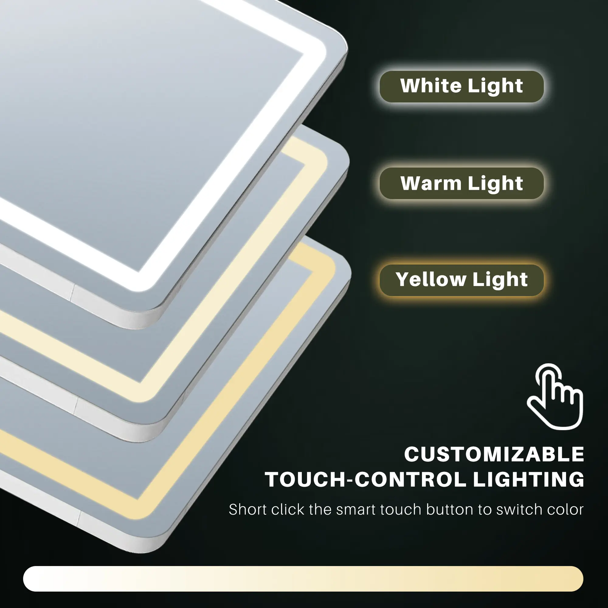 3 COLORS & ADJUSTABLE BRIGHTNESS: The mirror's brightness and color temperature are controlled via a smart touch button. A short press changes the color temperature between white light, warm light, and yellow light. A long press adjusts the brightness to your preference.