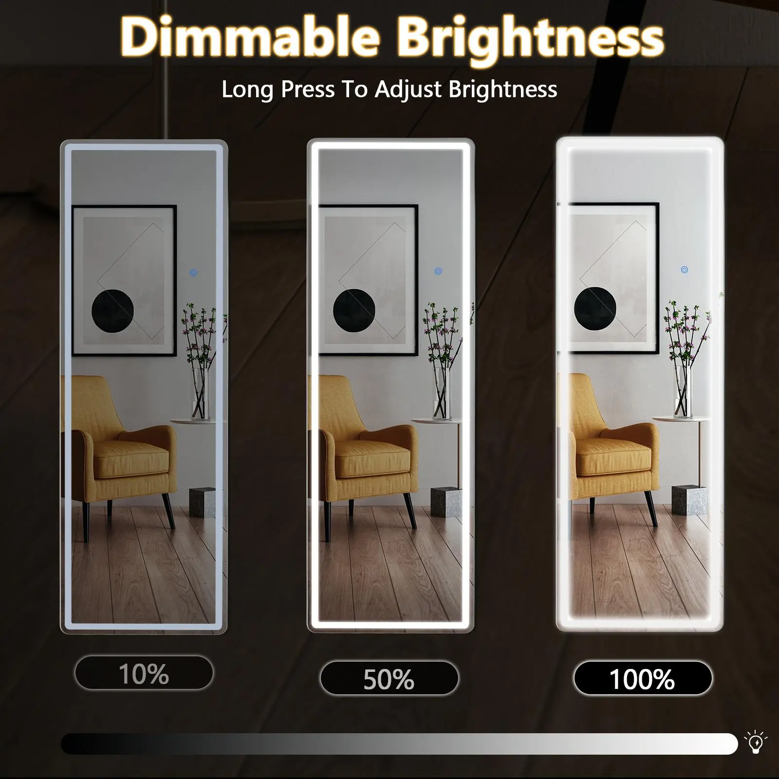 3 COLORS & ADJUSTABLE BRIGHTNESS: The mirror's brightness and color temperature are controlled via a smart touch button. A short press changes the color temperature between white light, warm light, and yellow light. A long press adjusts the brightness to your preference.