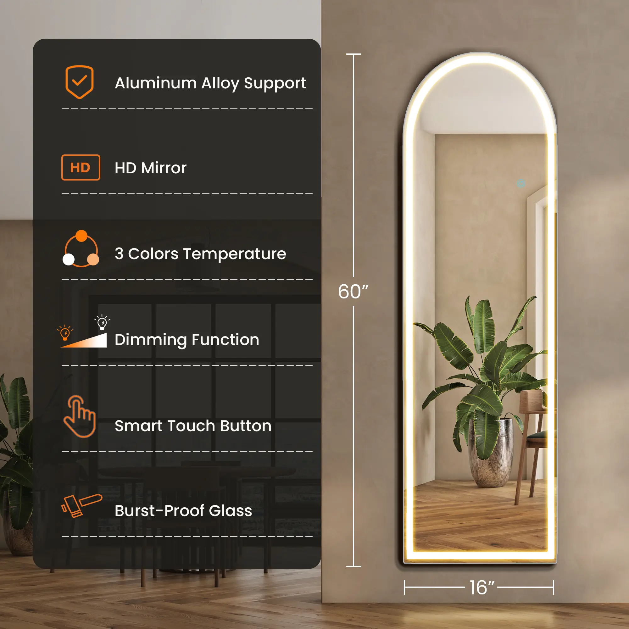 I ordered this thinking it was a lighted mirror, but it is not. It’s just a plain full-length mirror with no lighting at all. Very misleading description. I bought two expecting lighted mirrors, so this was disappointing.