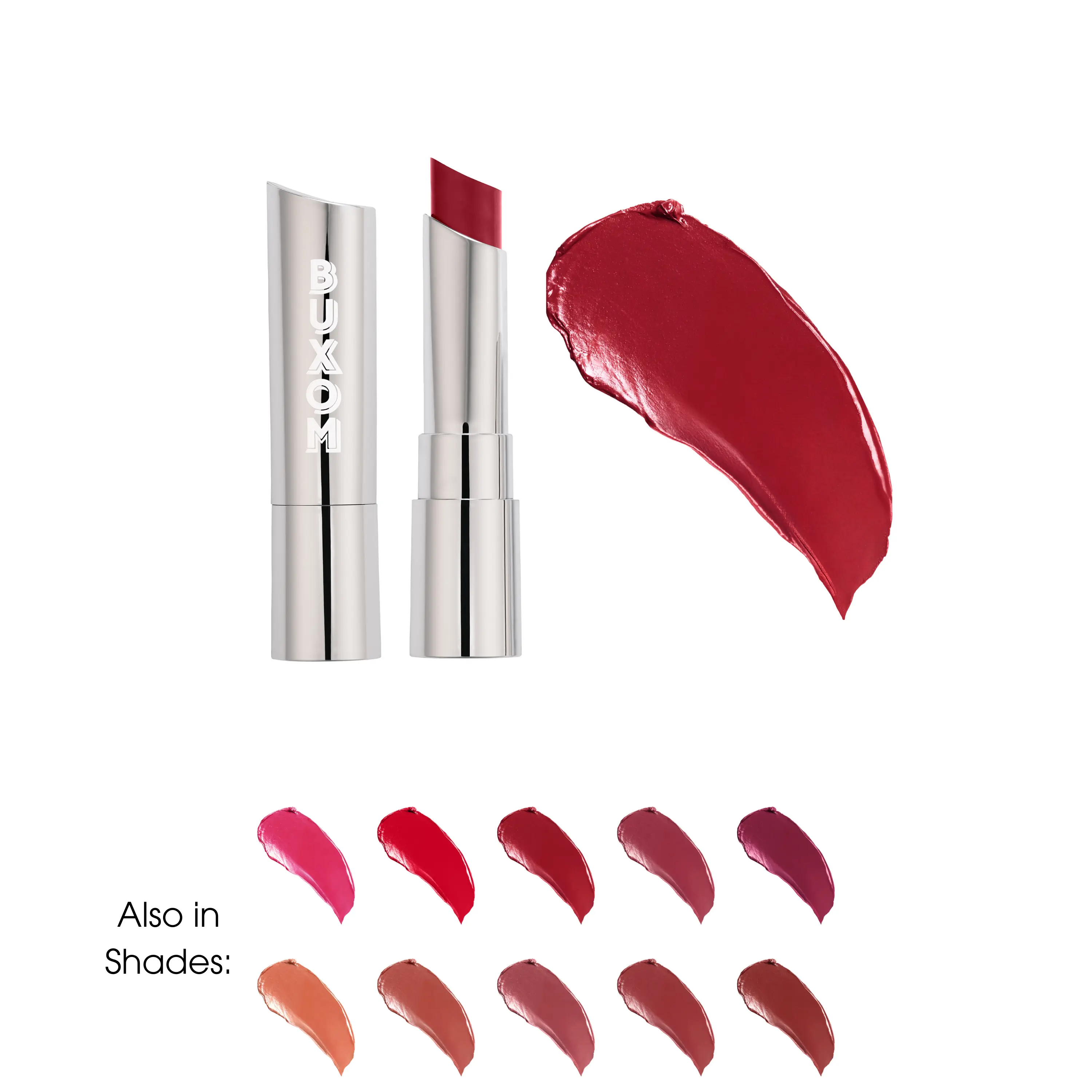 This creamy satin lipstick offers pigment-rich color in a single swipe. Infused with Peptides, Hyaluronic Acid, and Sunflower Wax, it leaves your lips moisturized, smooth, and soft. BUXOM is 100% cruelty-free and free from parabens, mineral oil, and petrolatum.