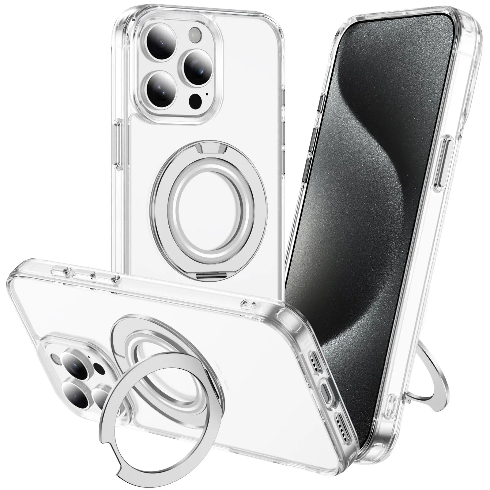 More than a stand, this case for iPhone 15 series with kickstand works as a stable support, a ring holder, and a magnetic partner all in one. Open it for hands-free viewing and a secure grip, close it and it becomes a seamless magnetic case compatible with most magnetic accessories. Made of durable zinc alloy, the stand ensures reliable daily use and reliable wireless charging without removing the case. Elevate your iPhone 15 series experience with this innovative case that flawlessly blends rugged protection with a minimalist aesthetic. A 360° rotatable zinc alloy ring stand ensuring a seamless MagSafe charging. When closed, it lies flush with the case providing pocket friendly carrying without the bulk. This versatile stand utilizes non-inductive bearing technology to provide stable viewing at any angle up to 120°, while the dual-layer shockproof construction and raised edges safeguard your screen and camera from every impact. The nano antioxidant layer provides resistance from stains, sweat and keeps the original color with anti-yellowing TPU that showcases your device’s original beauty. The case is finished with an ergonomic matte grip and upgraded magnets for a powerful, wobble-free connection to all your favorite accessories.