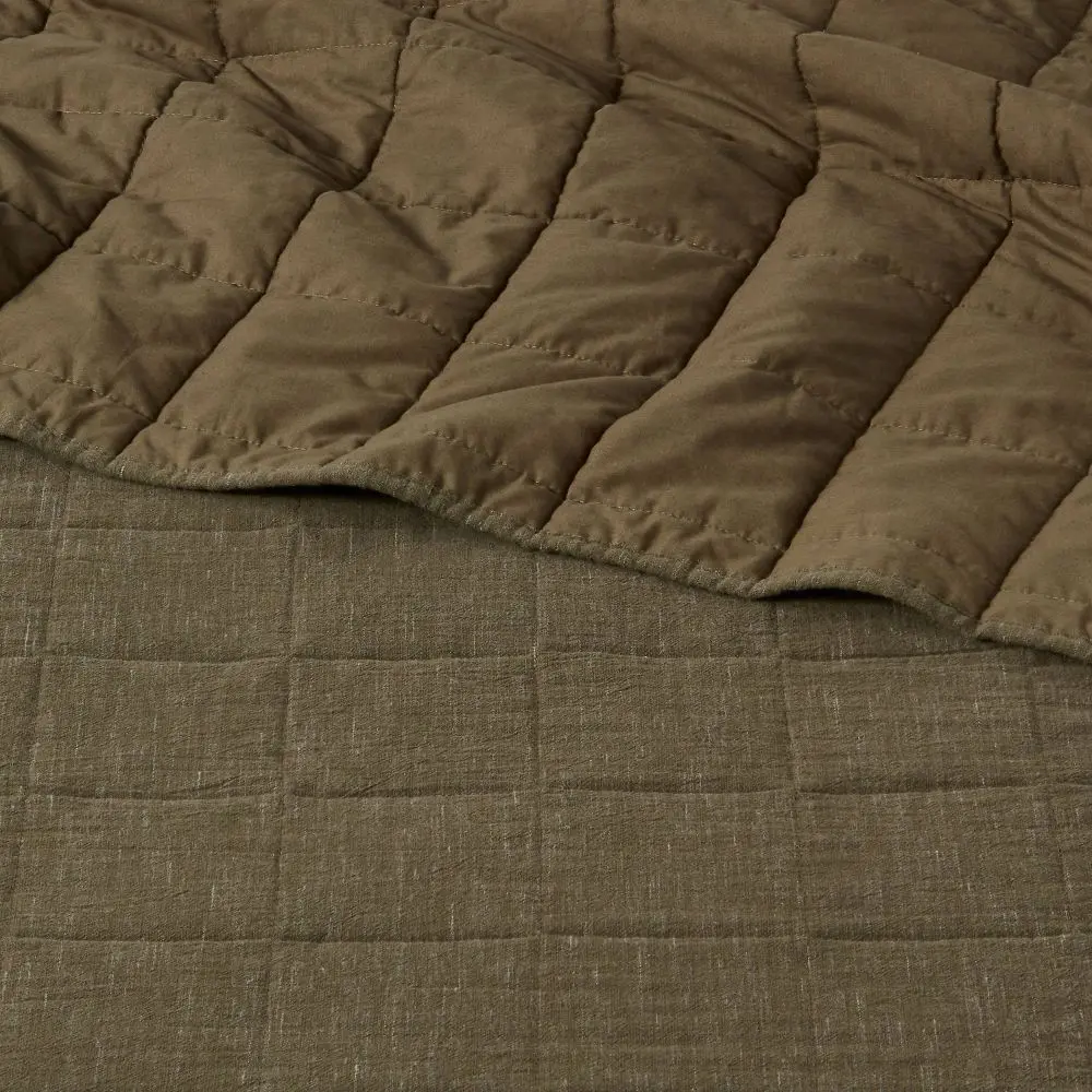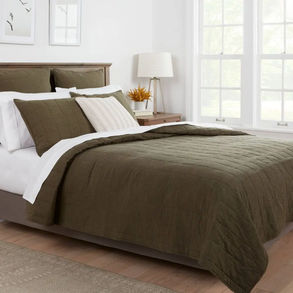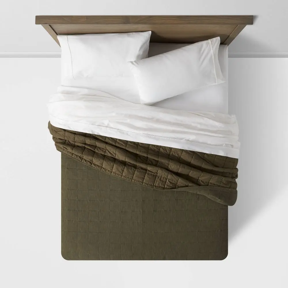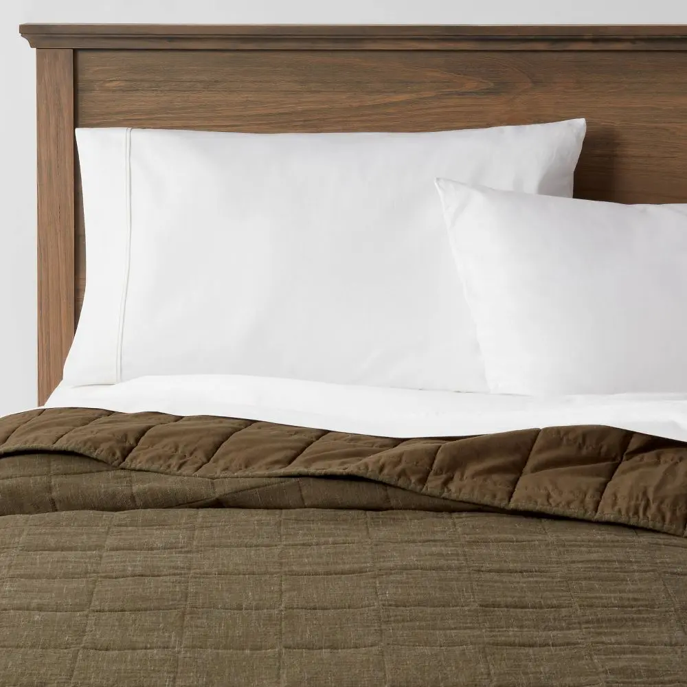 Create a soothing sleeping nook with the Space Dyed Cotton-Linen Quilt from Threshold. Crafted from a soft fabric blend with 100% cotton filling, this decorative quilt lends an extra layer of warmth to the top of your bed to let you drift off to dreamland in cozy comfort. Featuring a subtle space dyed design with a quilted front, it easily blends with your existing decor while giving you an array of choices to decorate your sleeping nook. Toss it over the comforter or duvet cover of your choice and coordinate it with matching shams or pillows to create an inviting resting space in your home.