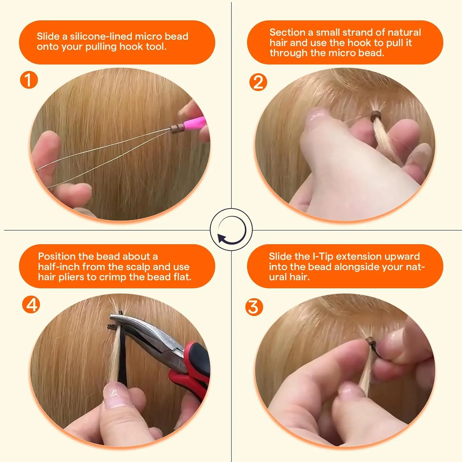 【Cold Fusion Hair Extensions 】 I-tip hair extension requires no heat for application and is also no glue is used because you apply I-Tip sticks with micro beads or rings, blends with your own hair naturally. It No harmless to your hair and scalp.