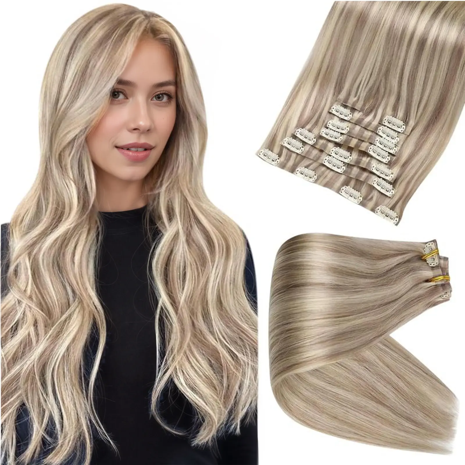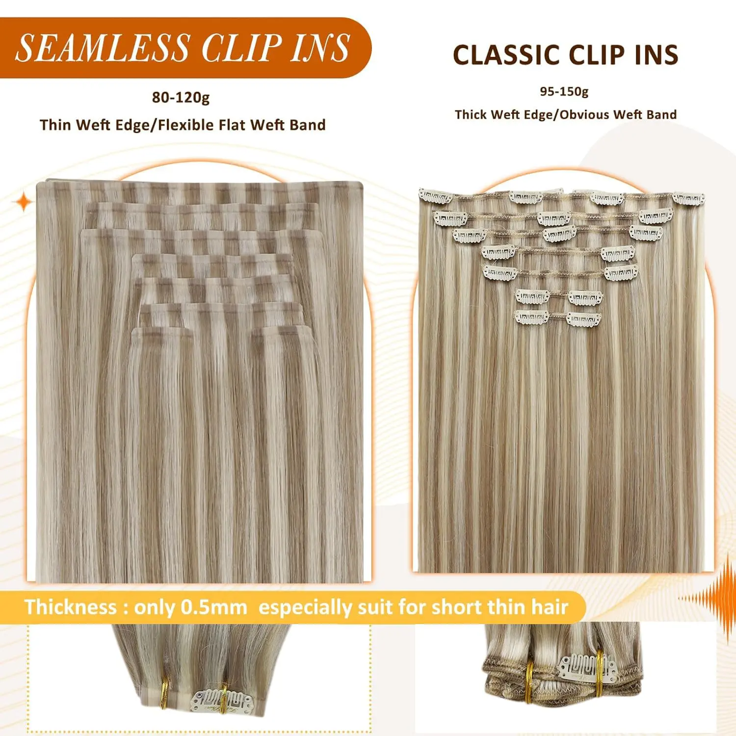 ·Full Shine Seamless Clip Ins Specification: 95-120 grams per pack with 8 clips. Available in various widths and shades.