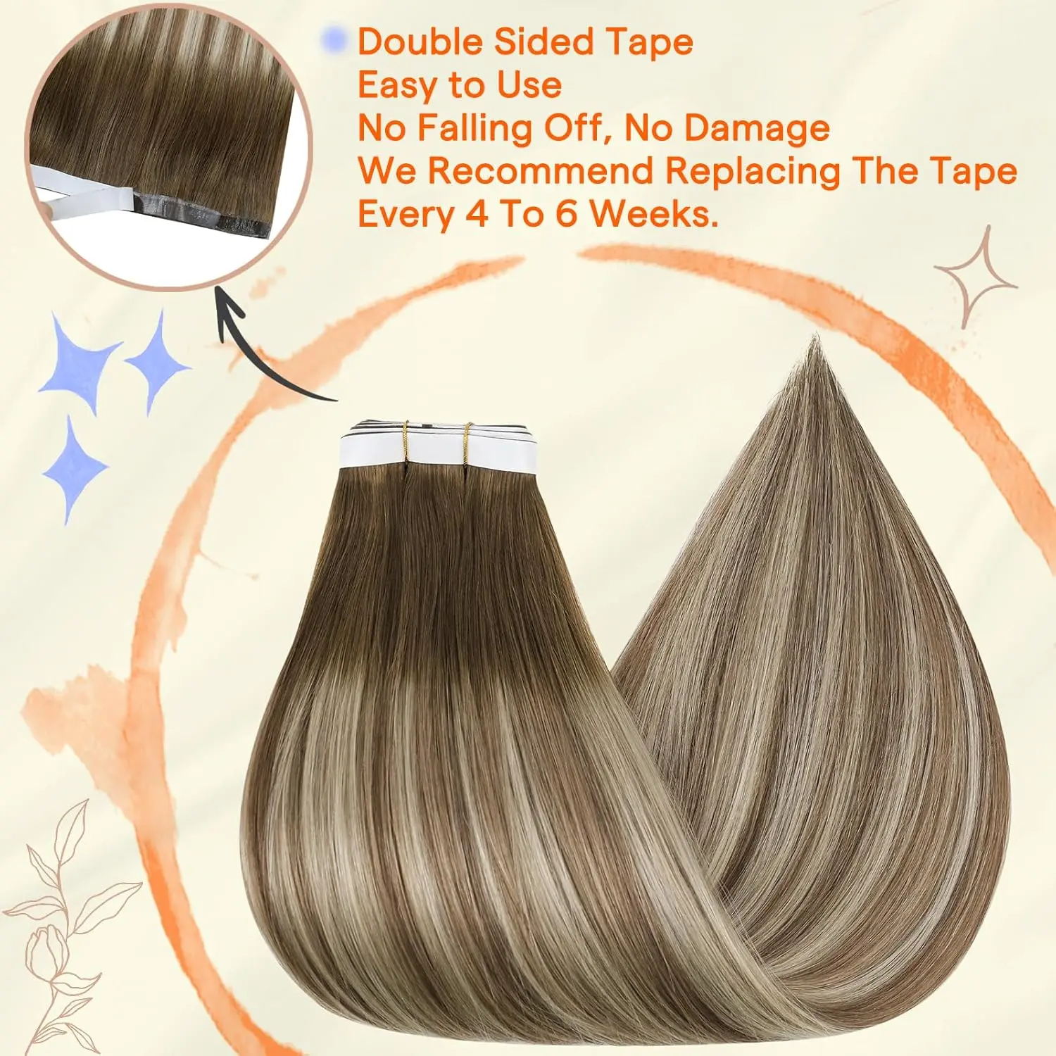·Adhesives & Chemicals: Always perform a patch test before full application. Some people may be allergic to tape material, so please stay away from the scalp. Maintain a 0.5-1cm distance from scalp roots when applying tape-ins. Replace tapes every 4-6 weeks.