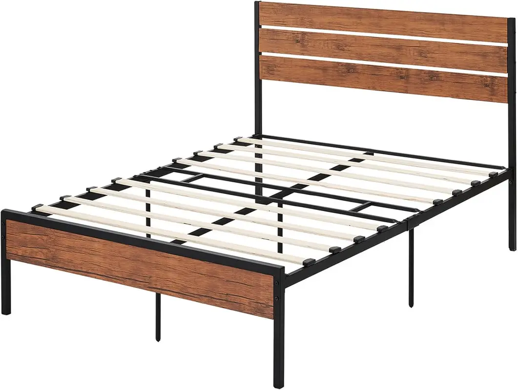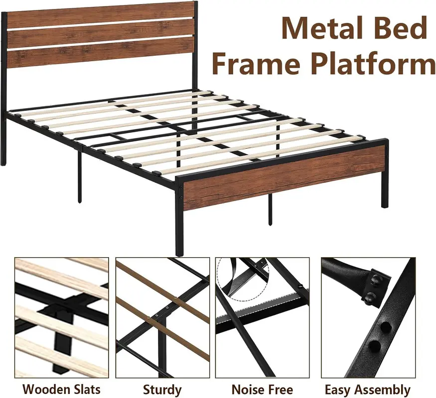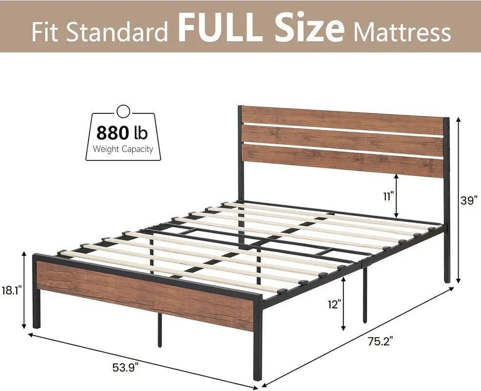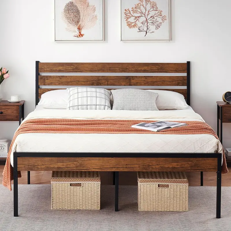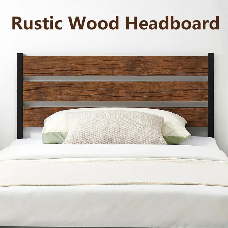 【Modern Design】This Rustic Brown Wood Farmhouse Full size platform bed frame with Headboard features high-quality wrought rod iron slats, modern classic and simple design style,adds a touch of style to your bedroom.