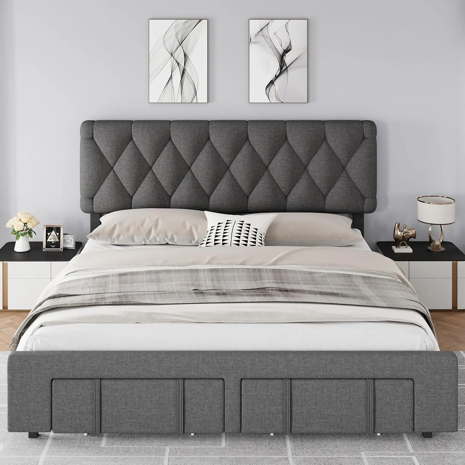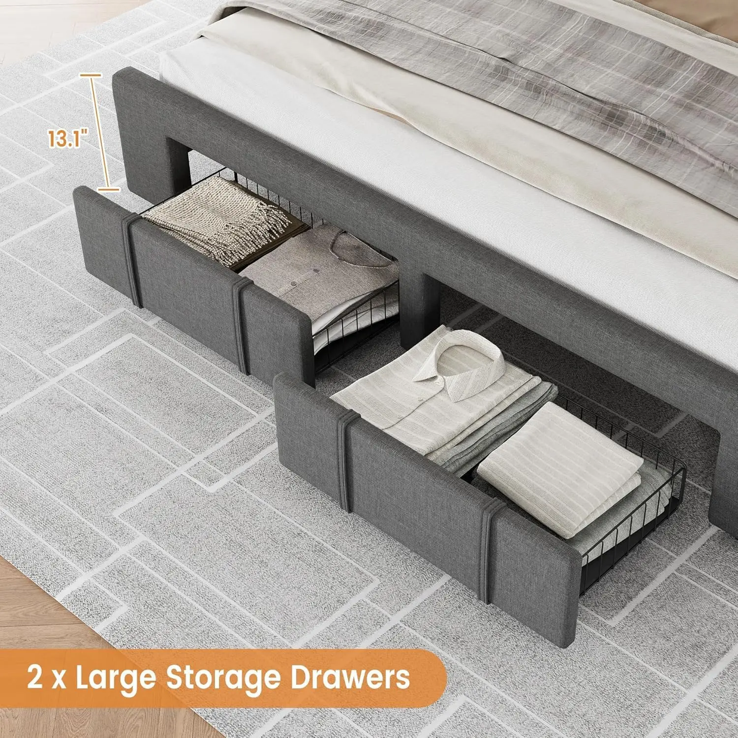 【Space-Saving Bed Frame】 Designed with convenience in mind, our full size bed frame features spacious drawers equipped with wheels for effortless access. These drawers are ideal for storing shoes, suitcases, luggage, and more