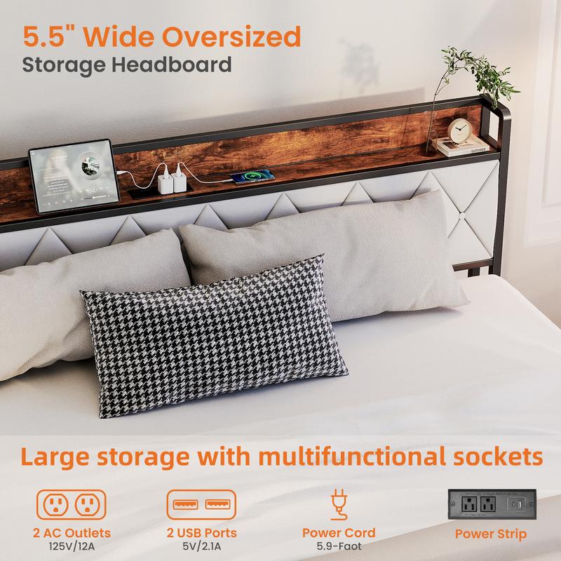 ·【Smart Storage & Convenient Charging】11" under-bed clearance offers ample space for storing clothes, boxes, or luggage. The headboard includes a 5.5" wide shelf and built-in charging with 2 outlets (125V/12A) and 2 USB ports (5V/2.1A) for easy device access.