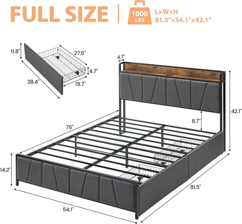 5. Full Size Bed Frame with 2 Storage Drawers and Charging Station Rustic Linen Upholstered Platform Bedframe with Storage Headboard Heavy Duty No Box Spring Needed Easy Assembly Noise Free