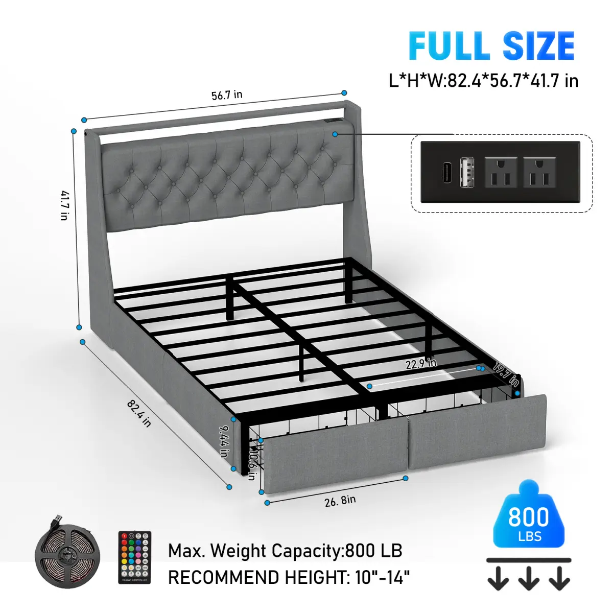 Product Name:Full Size Bed Frame with Storage Headboard, RGB LED Light & USB Charging Station - Grey
