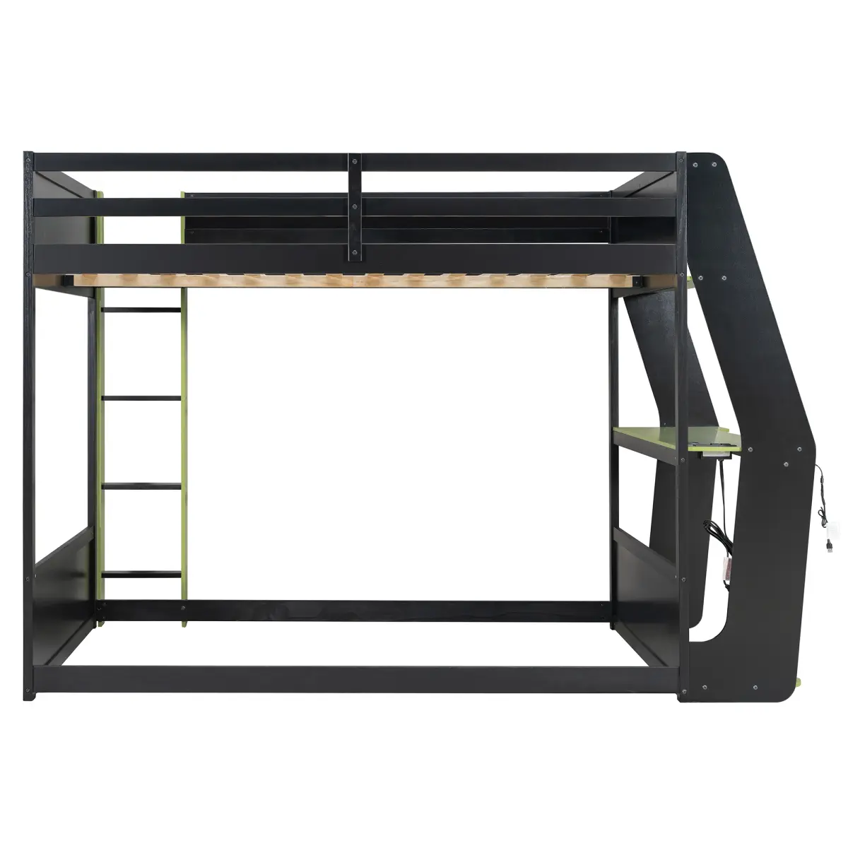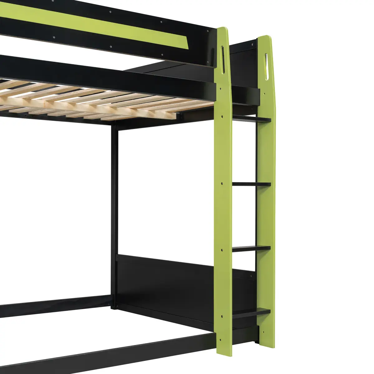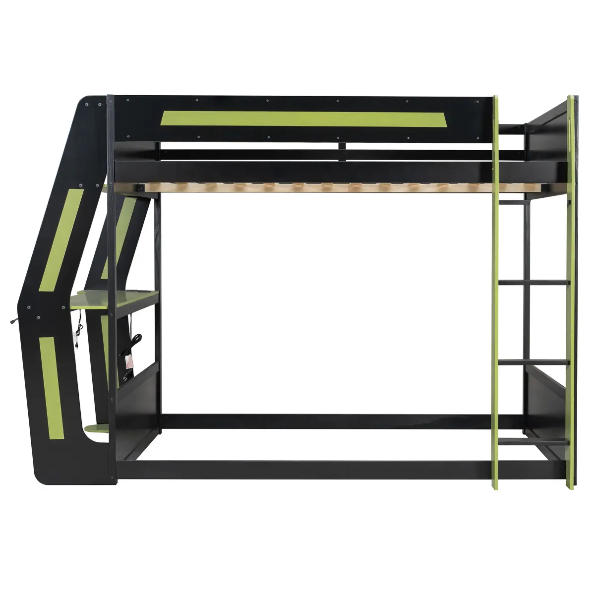 This full-size gaming bunk bed features a side-mounted oversized desk that creates a true esports workspace.Equipped with an RGB light strip, USB charging ports, and a cable grommet, the setup stays clean and powered.Available in Sky Blue, Neon Green, and Red, its bold, futuristic design brings style and function to any modern gaming bedroom.