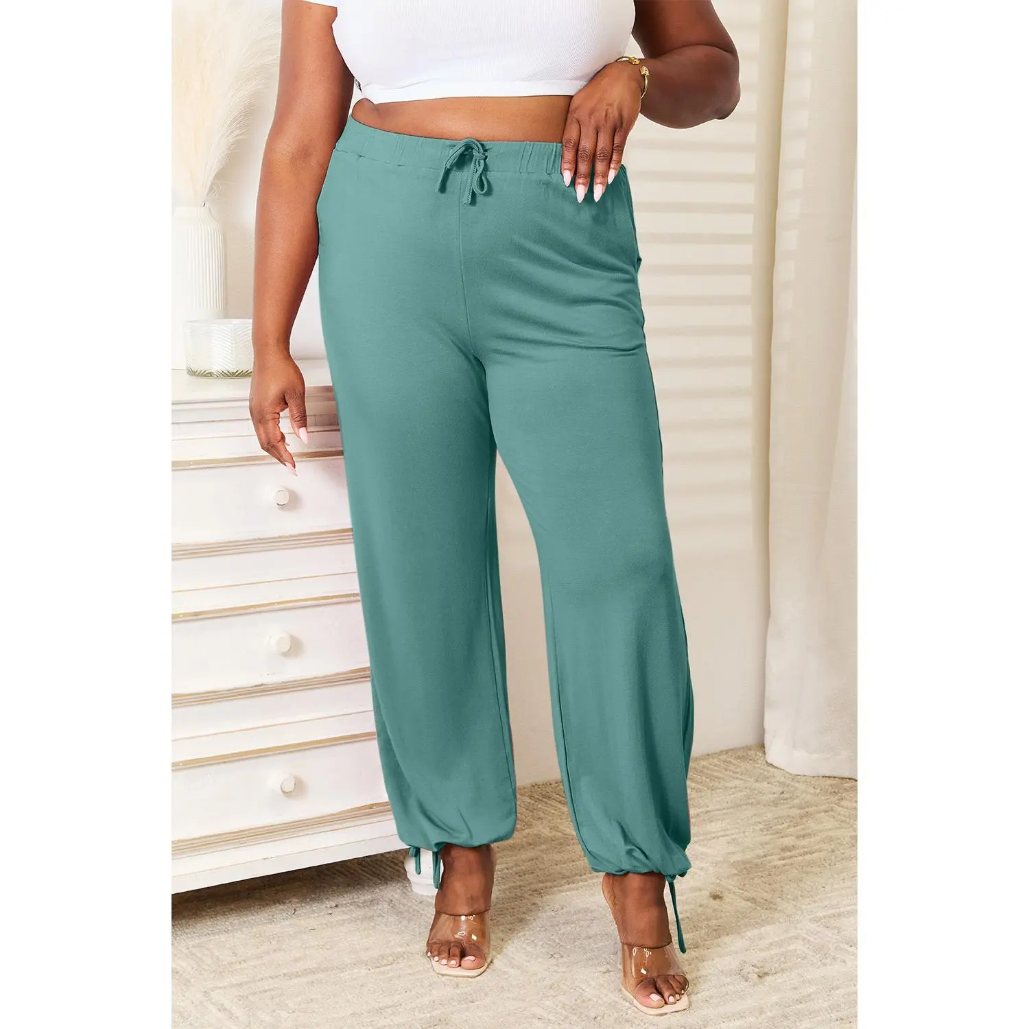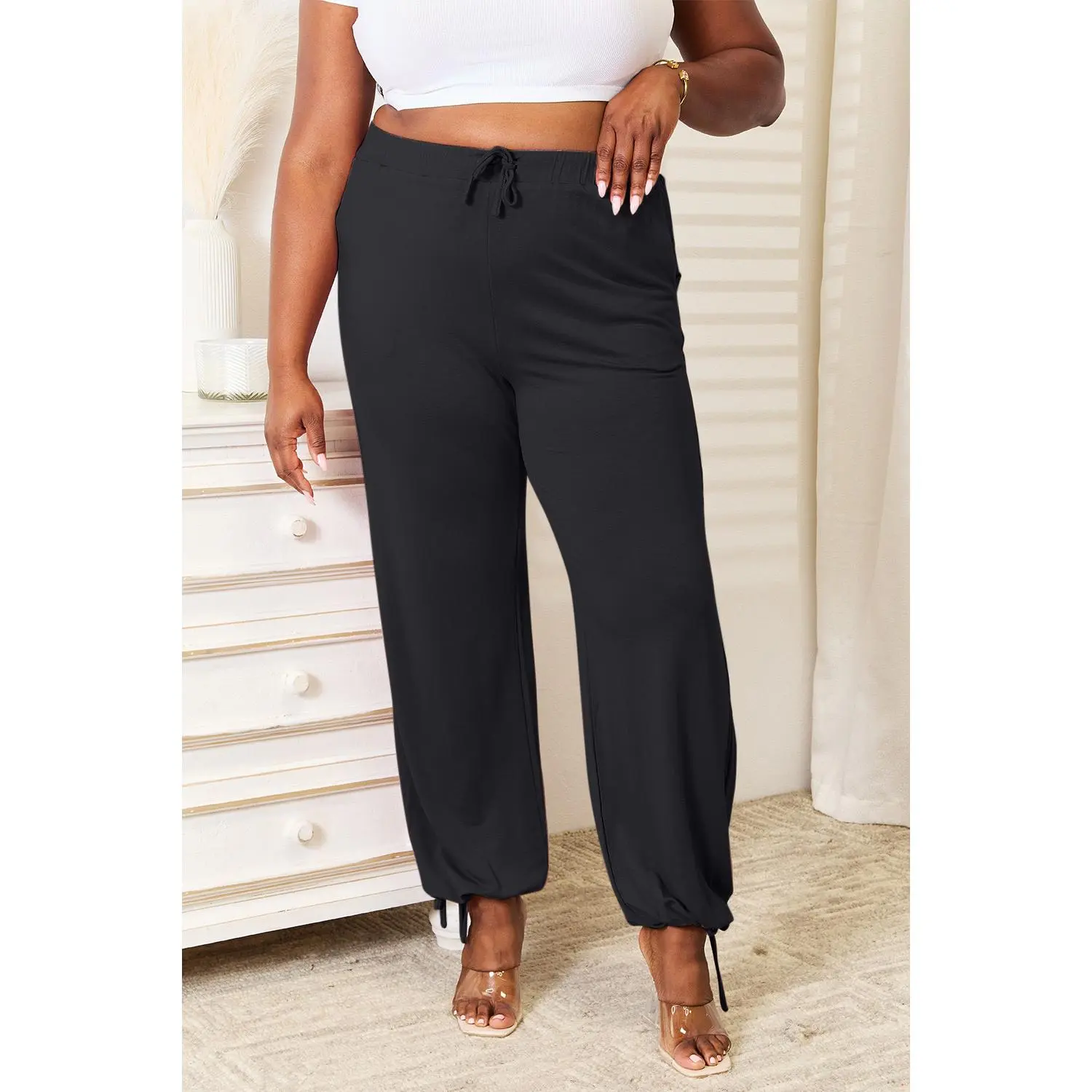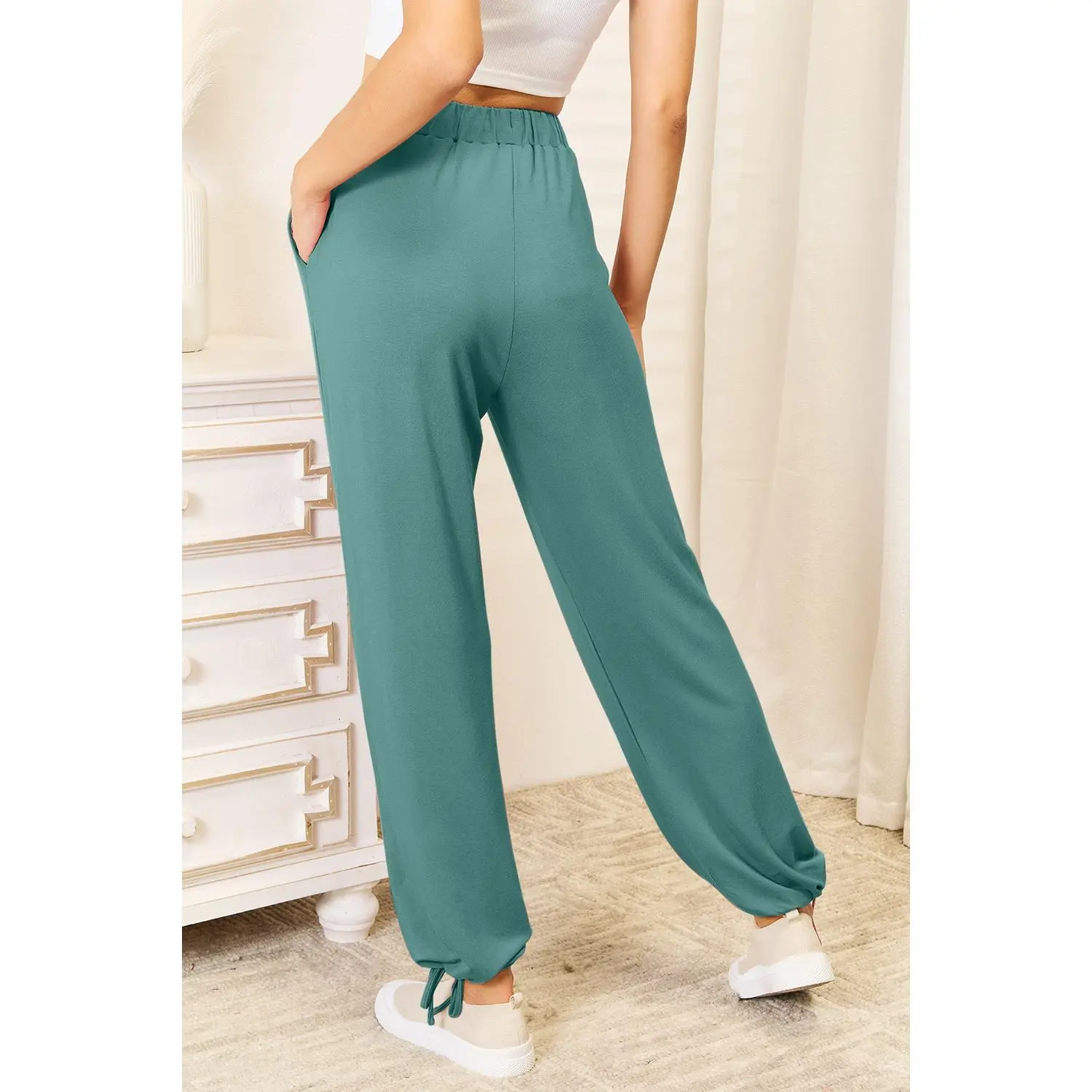 These drawstring waist pants are both comfortable and stylish. Designed with convenient pockets, they offer a practical and versatile option for everyday wear or lounging around.
