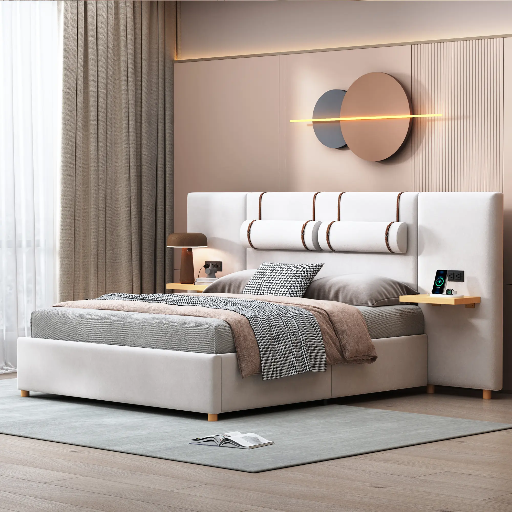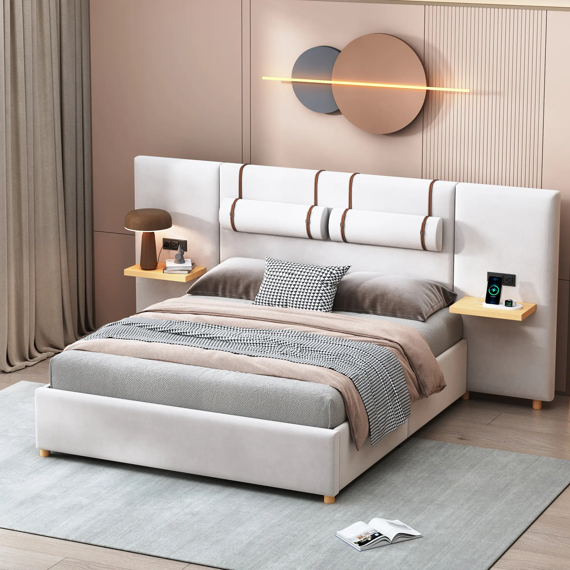 ·Plush Headboard with Built-in Pillows: Enjoy luxurious comfort with a plush upholstered headboard featuring two built-in pillows for added support.