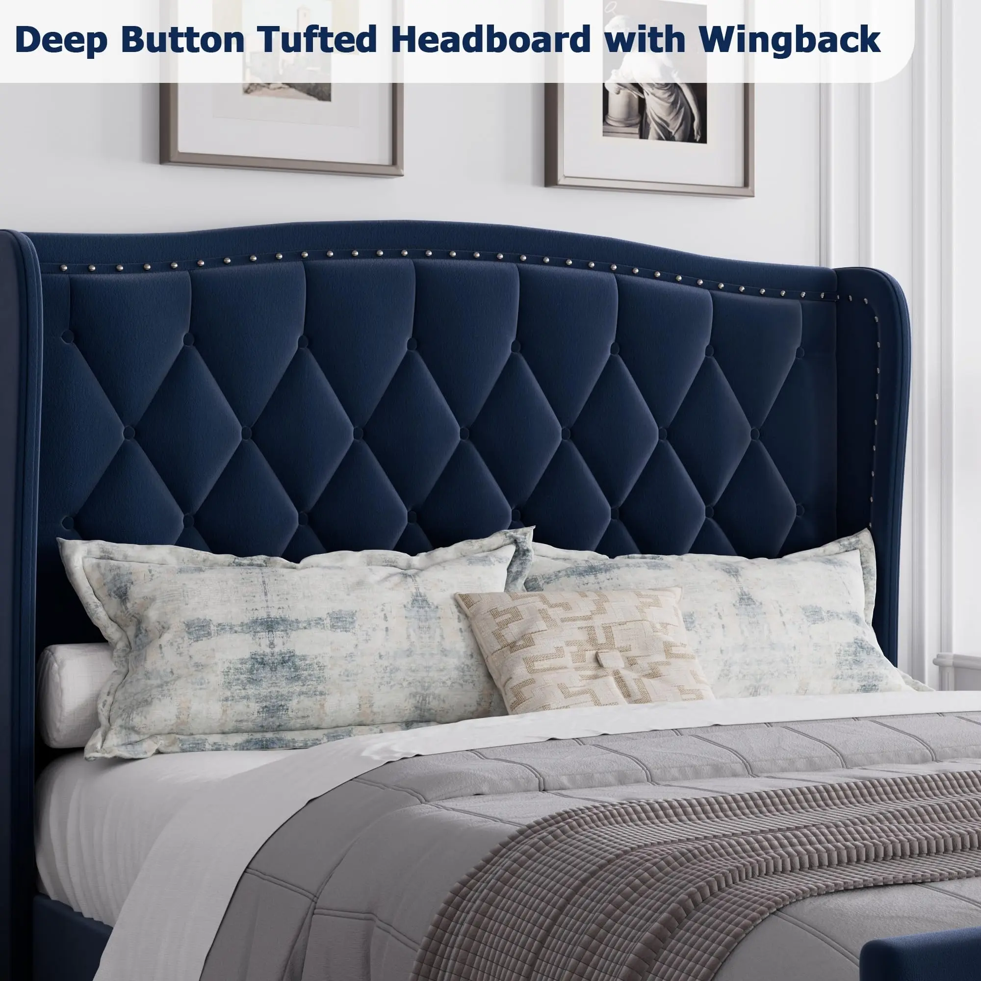 5. Full Size Bed Frame,Velvet Upholstered Full Size Platform Bed with Wingback Headboard,Wooden Slat Support,No Box Spring Needed,Easy Assembly,Navy Blue