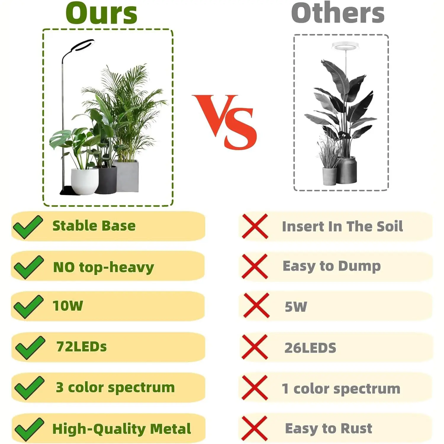 this plant light LED uses a highly efficient light source with 72 LEDs and higher lumen output. It emits all wavelengths from 420nm to 660nm, 5000K (36pcs white), 620-660nm (24pcs red light), 420-460nm (4pcs blue), Warm White 8pcs, ideal for all growth stages, and various plants such as succulents, orchids, herbs, tomatoes, for large and small plants, etc. Help your plants better