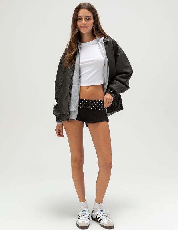 Full Tilt Low Rise Micro Pull On Shorts. Experience all-day comfort with the Full Tilt Low Rise Micro Pull-On Shorts for women, crafted from a soft polyester-spandex blend that moves with you. These black shorts feature a playful polka dot waistband and a low-rise fit, offering a flattering, comfortable silhouette. With an approximate 1.5in inseam, they’re perfect for layering or wearing alone during warm days, combining a lightweight feel with gentle stretch for effortless softness and everyday ease. 95% Polyester 5% Spandex. Hand wash. Imported.