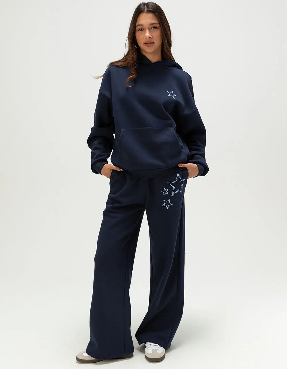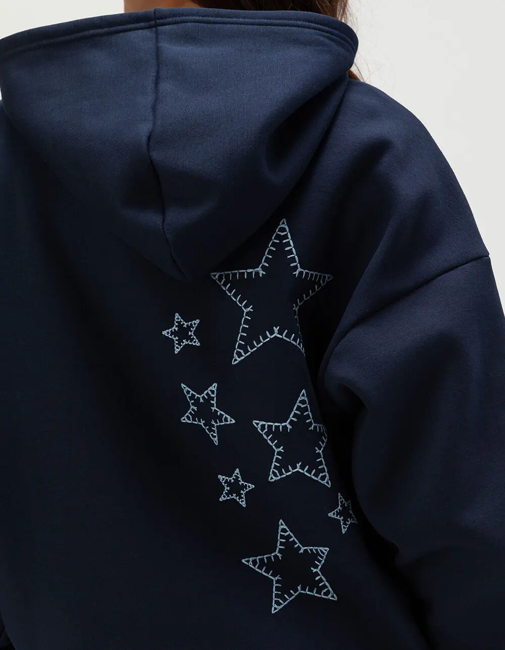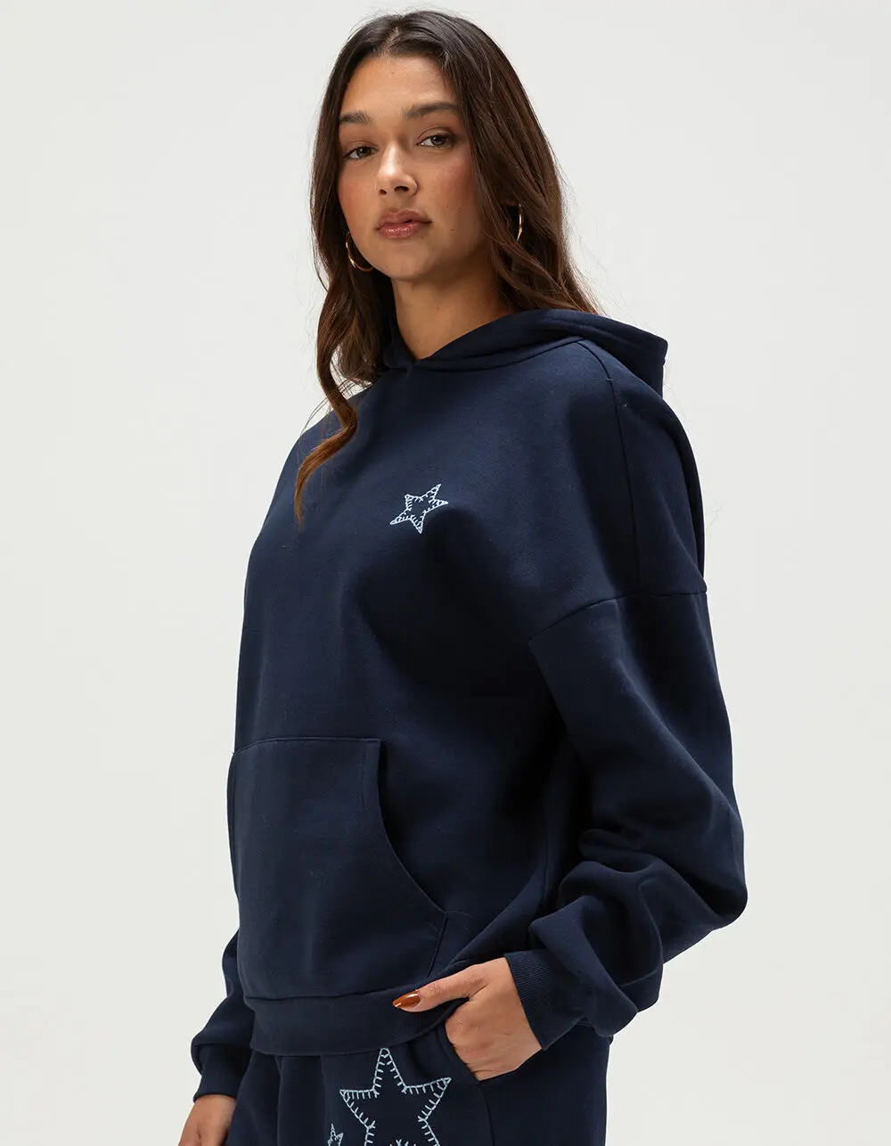 Full Tilt Embroidered Star Hoodie. Meet your new go-to layer: the Full Tilt Embroidered Star Hoodie. This navy fleece hoodie features a subtle embroidered star at the left chest, with multiple embroidered stars along the back right for a playful finish. A cozy fleece lining, fixed hood, and classic front pouch pocket bring everyday comfort, while cuffed long sleeves and a ribbed hem keep the fit snug and flattering for casual days and cool nights. 60% Cotton 40% Polyester. Machine wash. Imported.