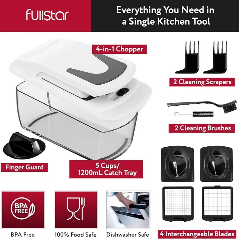 ·A Kitchen Essential - Whether you're a novice cook or a seasoned pro, the Fullstar Food Chopper is a must-have in any kitchen. It's versatile, easy to use, and dishwasher safe. Please read the instruction manual provided with the Fullstar food chopper closely before use.