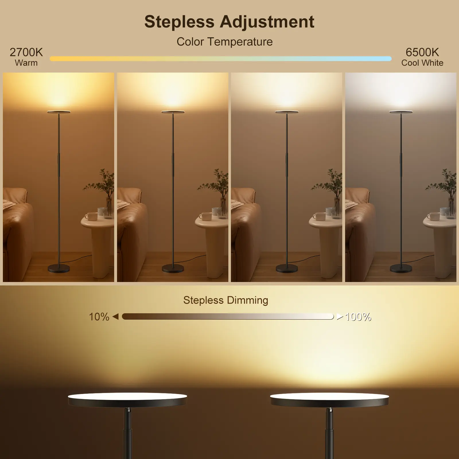 Everything looks good, setting and color wise. We have no lights installed in our room and this lamp brightens it up! 2nd to lowest light setting in photo :