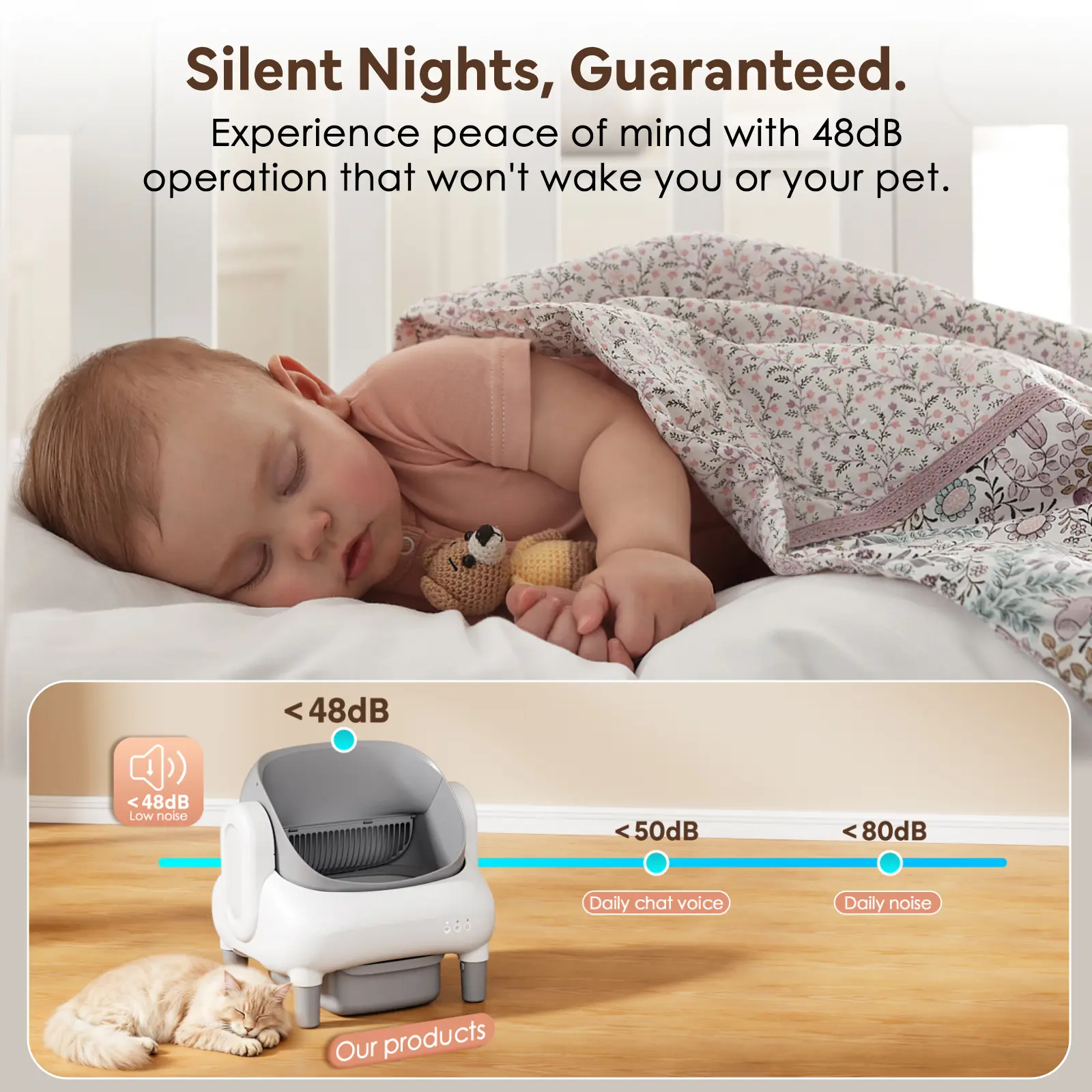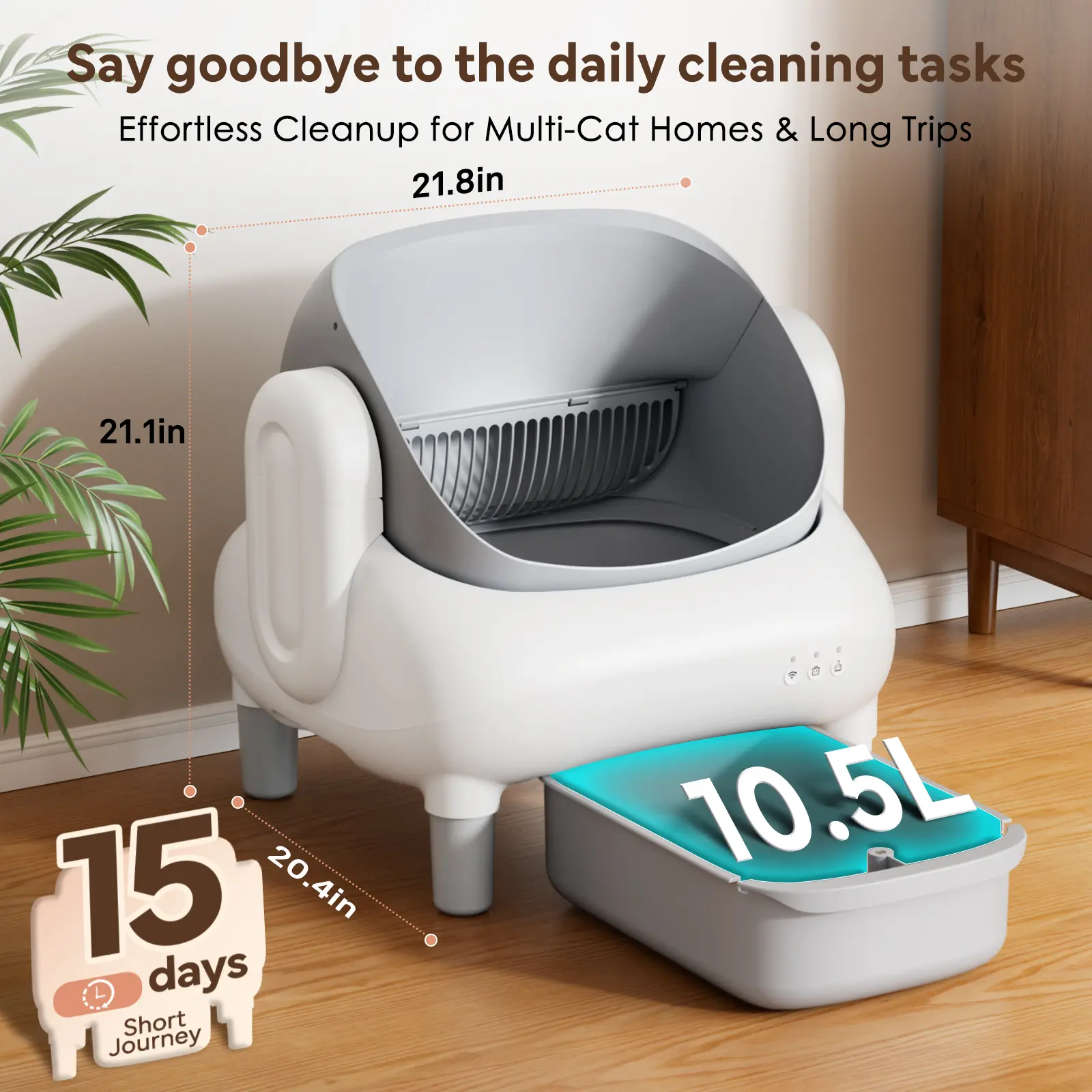 Features at a Glance- Open-Top Comfort- Dual Safety Tech- Smart APP Control- 10.5L Sealed Waste Bin- Leak-Proof & Reusable Design- Litter Compatibility- Quieter Operation
