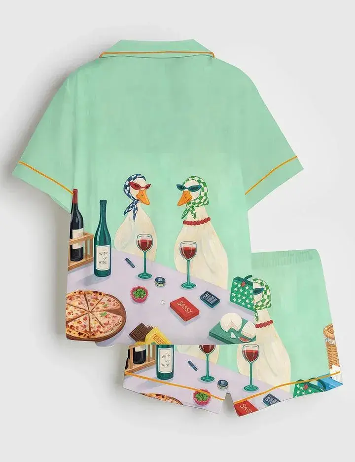 🎉 Quirky Stylish Ducks Cheese And Wine Scene Satin Pajama Set 🎉