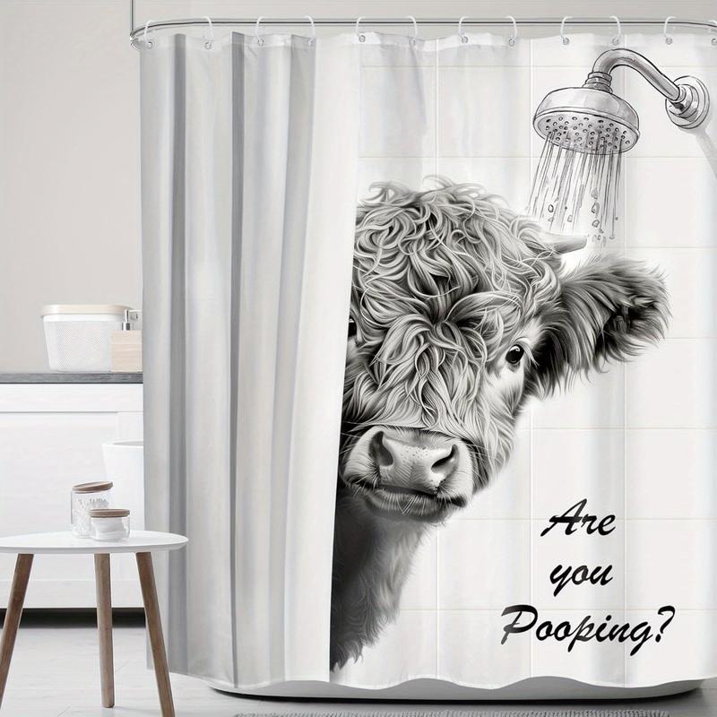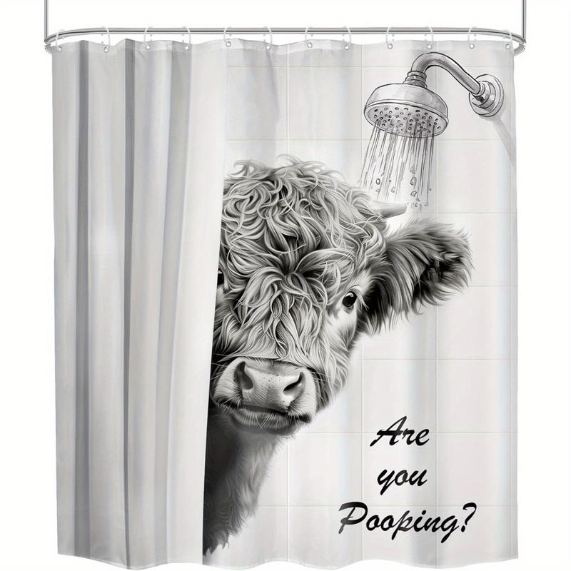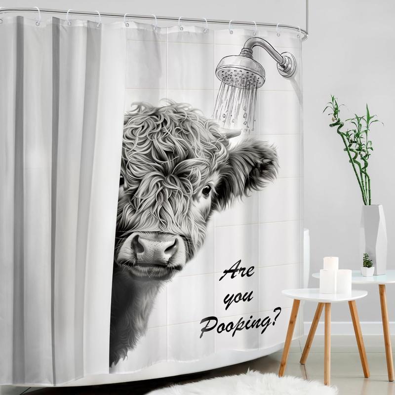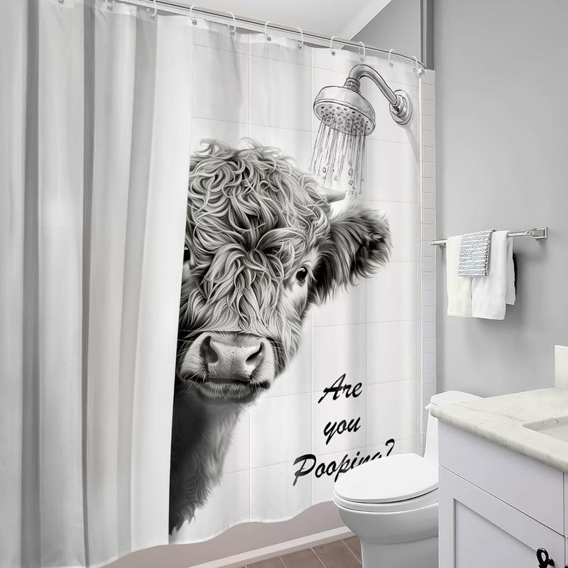 Funny Highland Cow Shower Curtain - "Are You Pooping?" Humorous Bathroom Decor, Rustic Farmhouse Design with Black & White Animal Print & Hooks Included for All-Season Use Bathroom Decor, Playful Text Design, Hooked Installation, Easy Maintenance Fabric