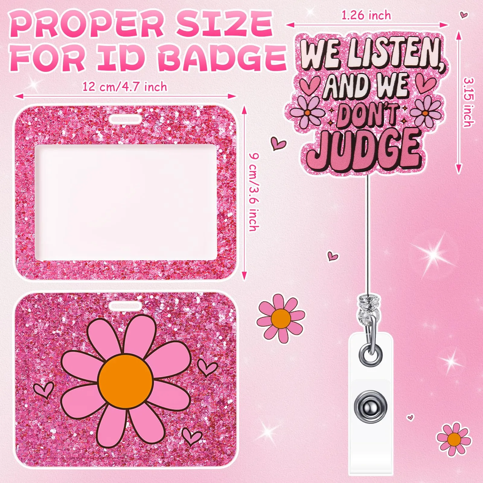 the sliding horizontal ID badge holder measures about 4.72 x 3.54 inches and we don't judge badge reel extends up to about 24 inches