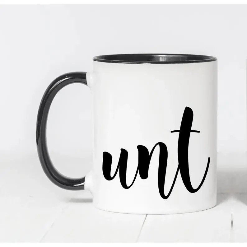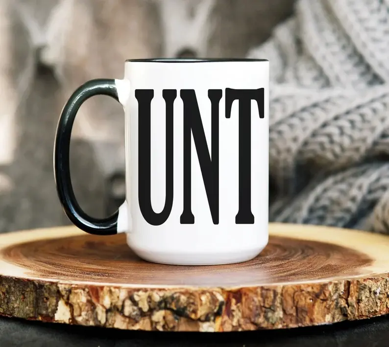 Front of the cup is funny but the back just says “UNT” because there’s not handle to make it a C