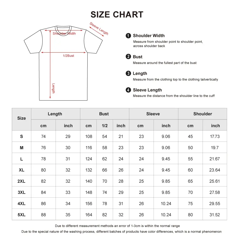 Please note that due to different measurement methods, an error of 1-3cm is within the normal range. Enjoy the perfect combination of comfort and style with our T-shirt!