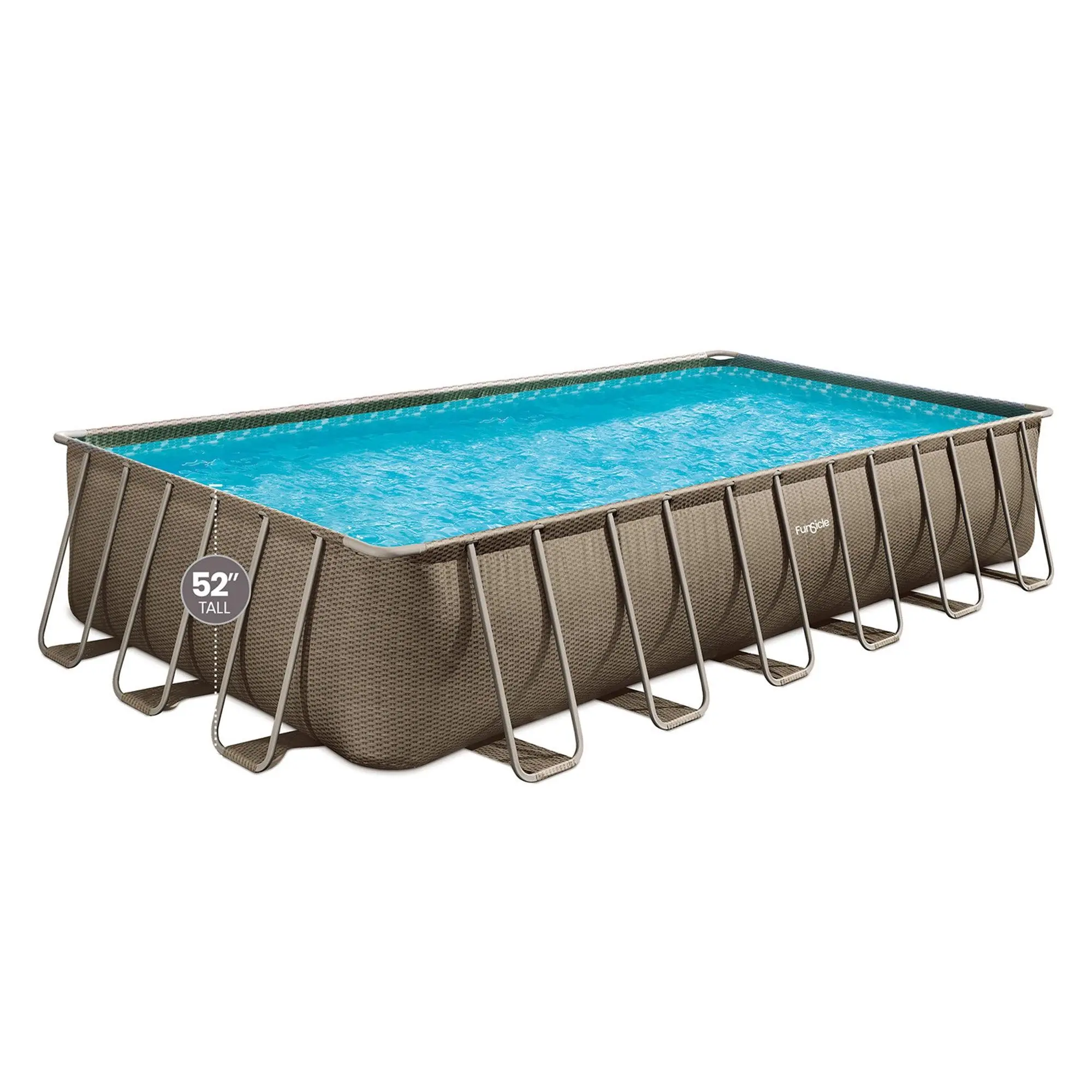 Relax the day away or get a water workout in with the Funsicle 24-Foot Oasis Designer Lap Above Ground Pool. Whether it's unwinding by soaking up the sun or engaging in bracing water exercises, this pool offers a wonderful setting. Crafted for both relaxation and fitness, it's your go-to choice for a refreshing aquatic experience.This outdoor above-ground frame pool invites you to cool down in luxury and style. Sporting a dark triple basketweave liner and rectangular shape, this pool for the backyard gives an elegant touch to your outdoor space. The modern matte finish on the ultra-strong oval poles protects against scratches and corrosion so that your premium pool lasts longer. A powerful SkimmerPlus filter pump, type C pool filter cartridge, and a JetMaxx Aeration feature are included, providing you with cleaner, purer water.For help with keeping the pool debris-free, the Deluxe maintenance kit and durable pool cover are also included. A ground cloth is provided for extra puncture protection, and the SureStep ladder can be used for safe pool access. This family pool is ideal for everything: from floating to lap swimming to a variety of water activities with enough space for up to 13 people ages 6 years old and up.For an ideal choice for summer social gatherings, exercise, or everyday refreshments, the 24-Foot Oasis Designer Lap Above Ground Pool is a sure winner.