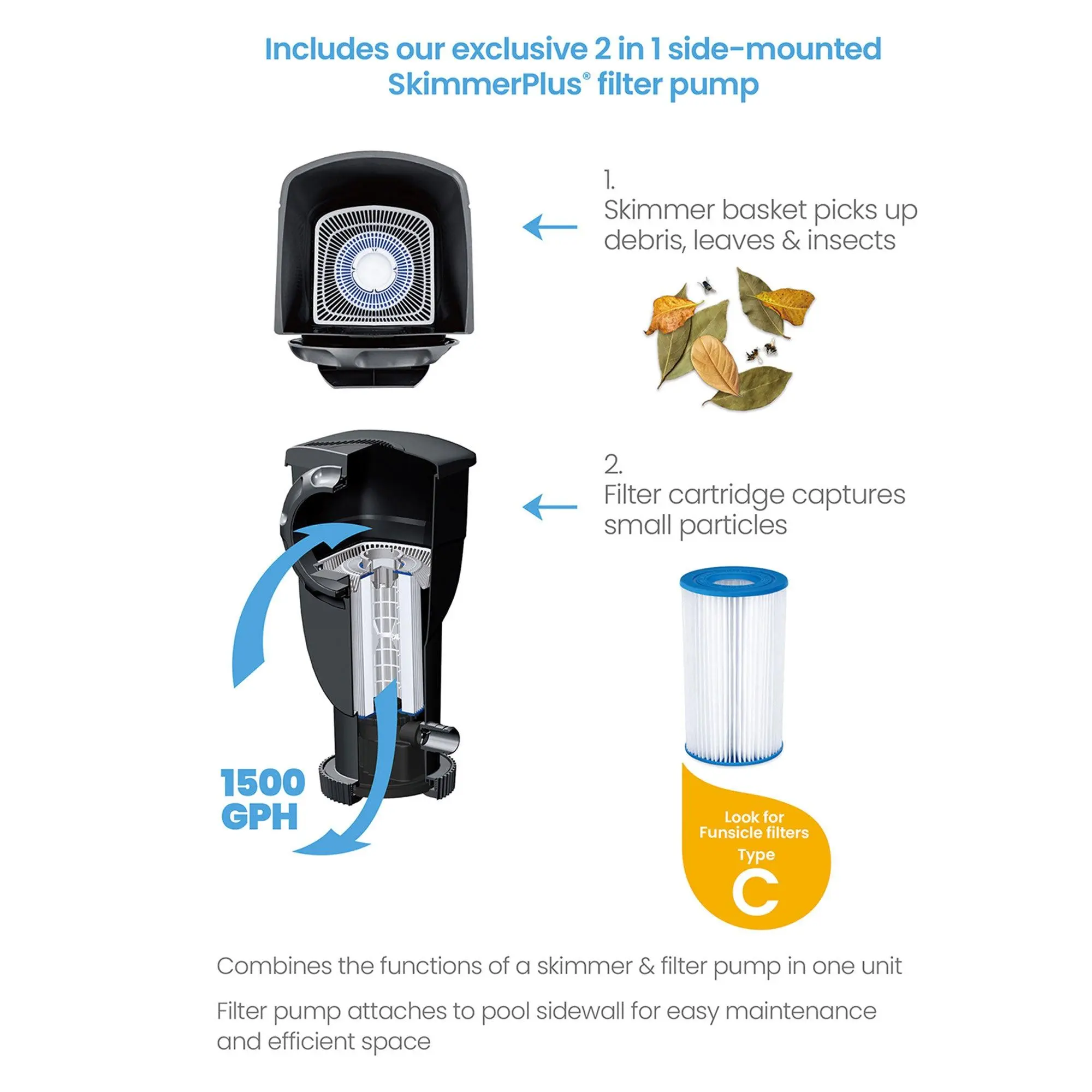 Includes 110-120V SFX1500 SkimmerPlus cartridge filter pump and a JetMaxx Aeration feature, providing you with cleaner, purer water