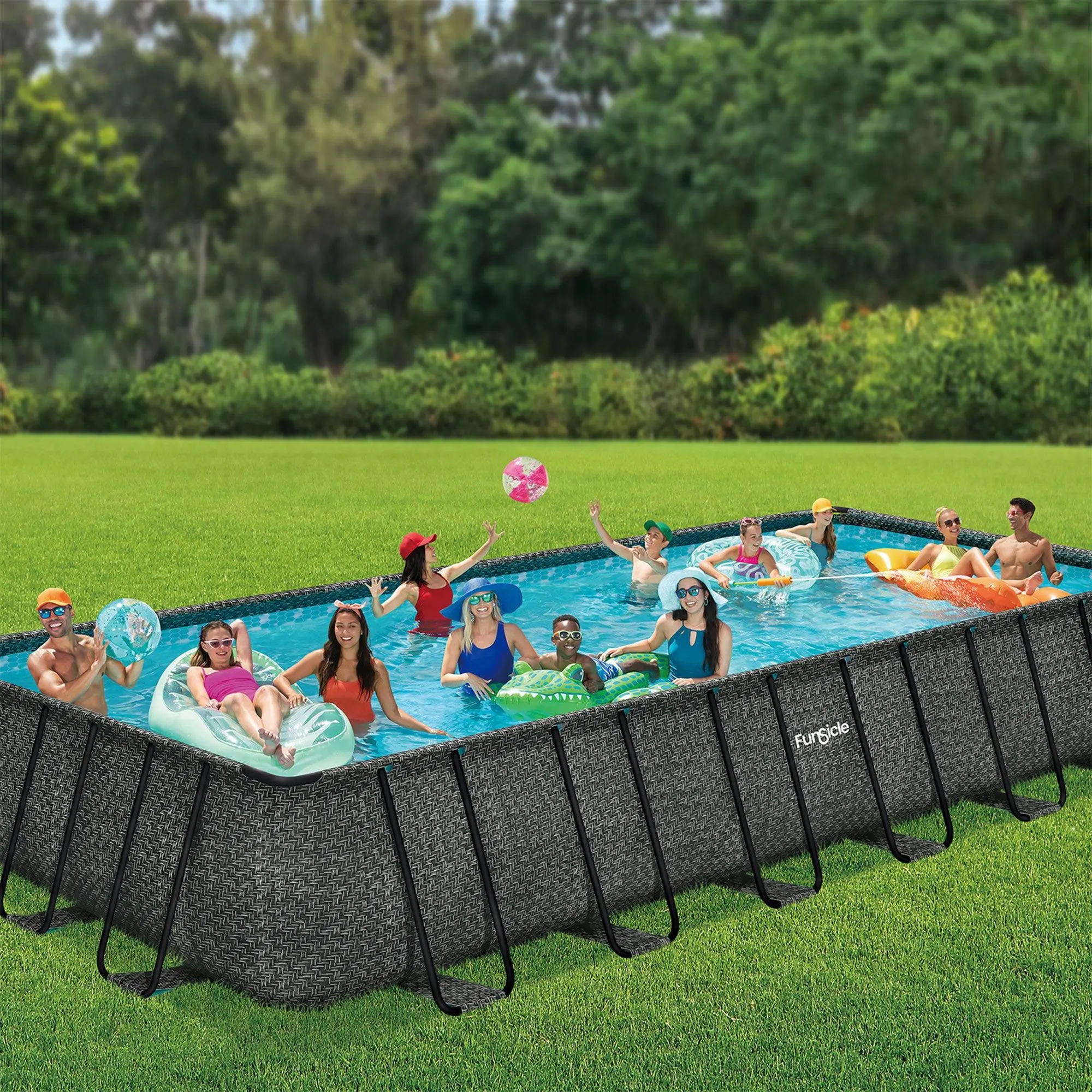 Relax the day away or get a water workout in with the Funsicle 24-Foot Oasis Designer Lap Pool. This pool provides the most spacious and luxurious all-in-one experience for anybody wanting to create that swimming pool 'wow' factor in their backyard. Featuring an elegant Dark Herringbone exterior print with a bright and delightful interior honeycomb print for extra flair, this pool for the backyard provides a modern style that accommodates 12 to 13 people comfortably. Made with durable 3-ply Toughmesh materials that resist punctures, this premium above-ground pool comes with a strong and sturdy metal frame to ensure the ultimate in durability and safety. The modern matte finish on the ultra-strong oval poles prevents scratches and corrosion. This pool comes with a powerful SFX1500 SkimmerPlus Filter Pump and a JetMaxx Aeration feature, providing you with cleaner, purer water. It also includes a SureStep ladder to safely enter and exit the water. This 24ft oasis designer lap pool is best for those wanting to match their backyard style and patio décor.Growing families, party enthusiasts, and active swimmers will get the most out of the Funsicle Oasis Designer Pool for years to come in your backyard for a summer full of fun in the water. For a perfect choice for summer social gatherings, exercise, or everyday refreshments, the 24-foot Oasis Designer Lap Pool is a sure winner.