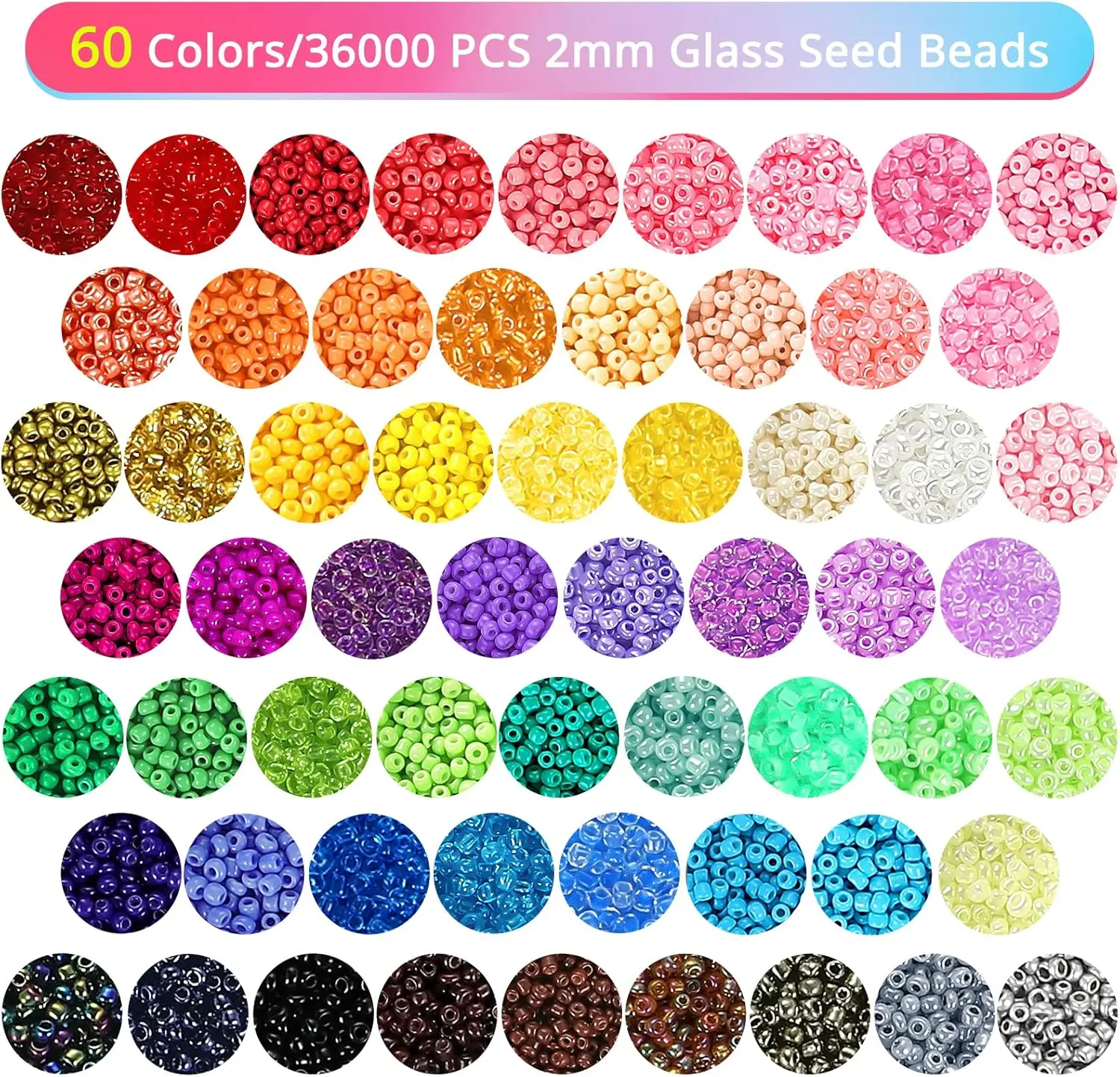 · Great Value Set: A total of 3 boxes beads of jewelry making kit, including 36000 counts 2mm seed beads, 400 counts letter beads, 50counts evil eye beads, 50counts pearl beads(25counts 4mm + 25counts 6mm), 50counts smile face beads, 50 counts heart beads and 4 rolls 0.5mm elastic string (Length of each roll is 15m/49ft).