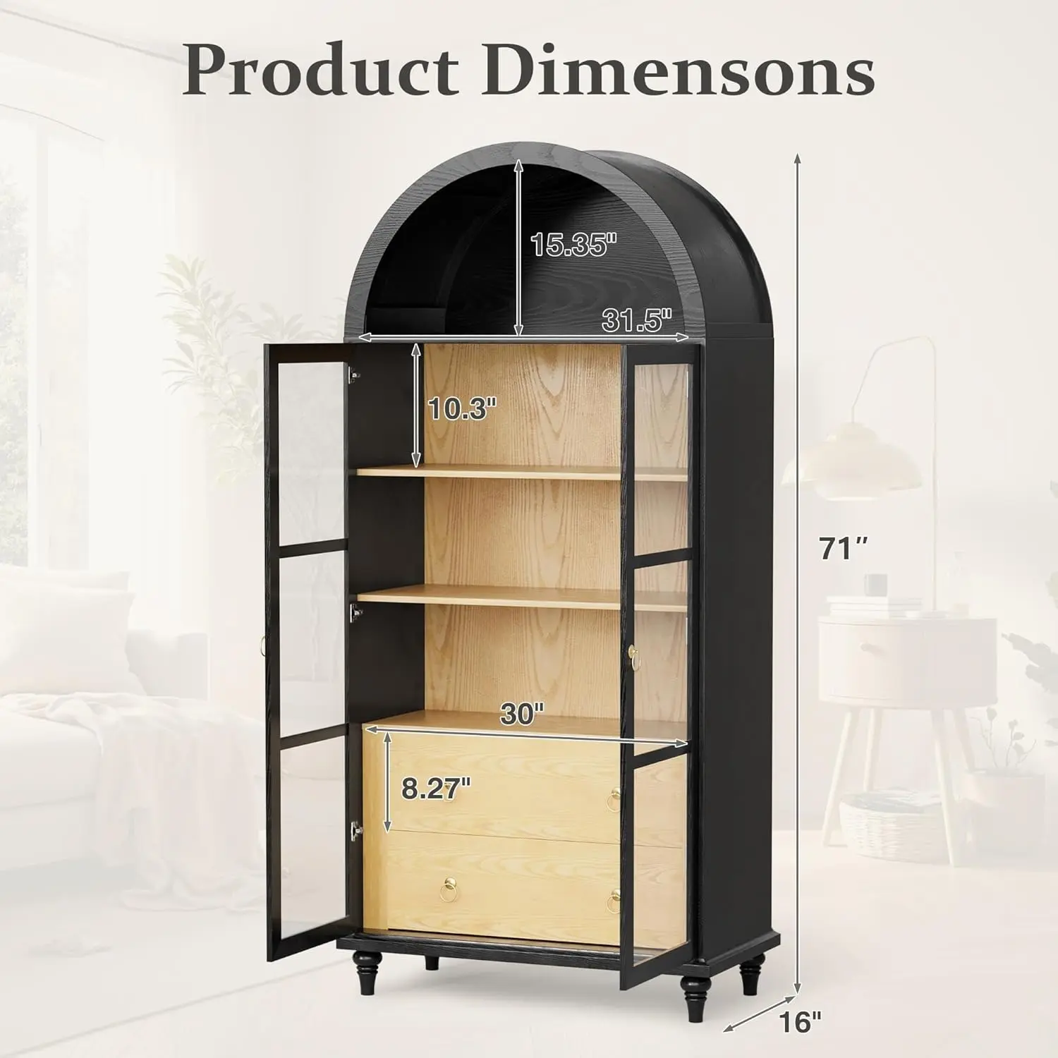 ·71" Tall Arched Design: This arched cabinet(16"D x 31.5"W x 71"H)eatures a sleek 71-inch height and an elegant arched design, adding a touch of modern style to kitchens, dining rooms, bathrooms, or living rooms.