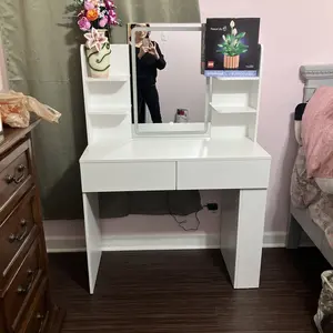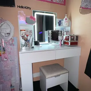 Our Bright and Adjustable Makeup Mirror vanity desk is a must-have. The LED light strip around the mirror offers 3 color options and adjustable brightness via touch switch, suiting various makeup needs and moods. It features ample storage with 2 drawers, 4 tabletop shelves and 2 side shelves for cosmetics and tools. The wide 35.4 (L) X 15.7 (W) inches tabletop ensures easy access to daily products. Its elegant pure color design, with no-pull handle drawers, matches any decor. Comes with detailed instructions and labeled accessories for easy assembly. We're also here to support you.