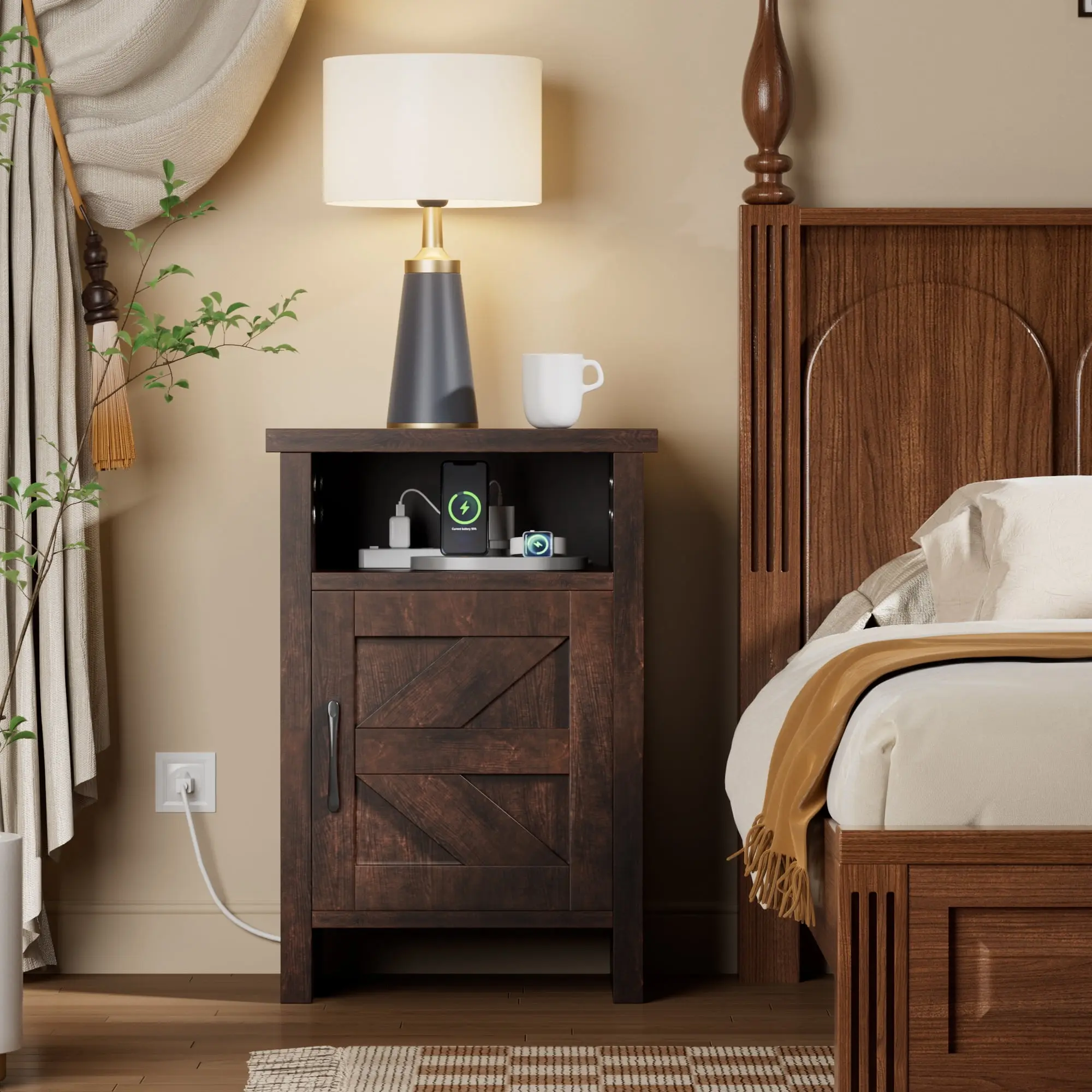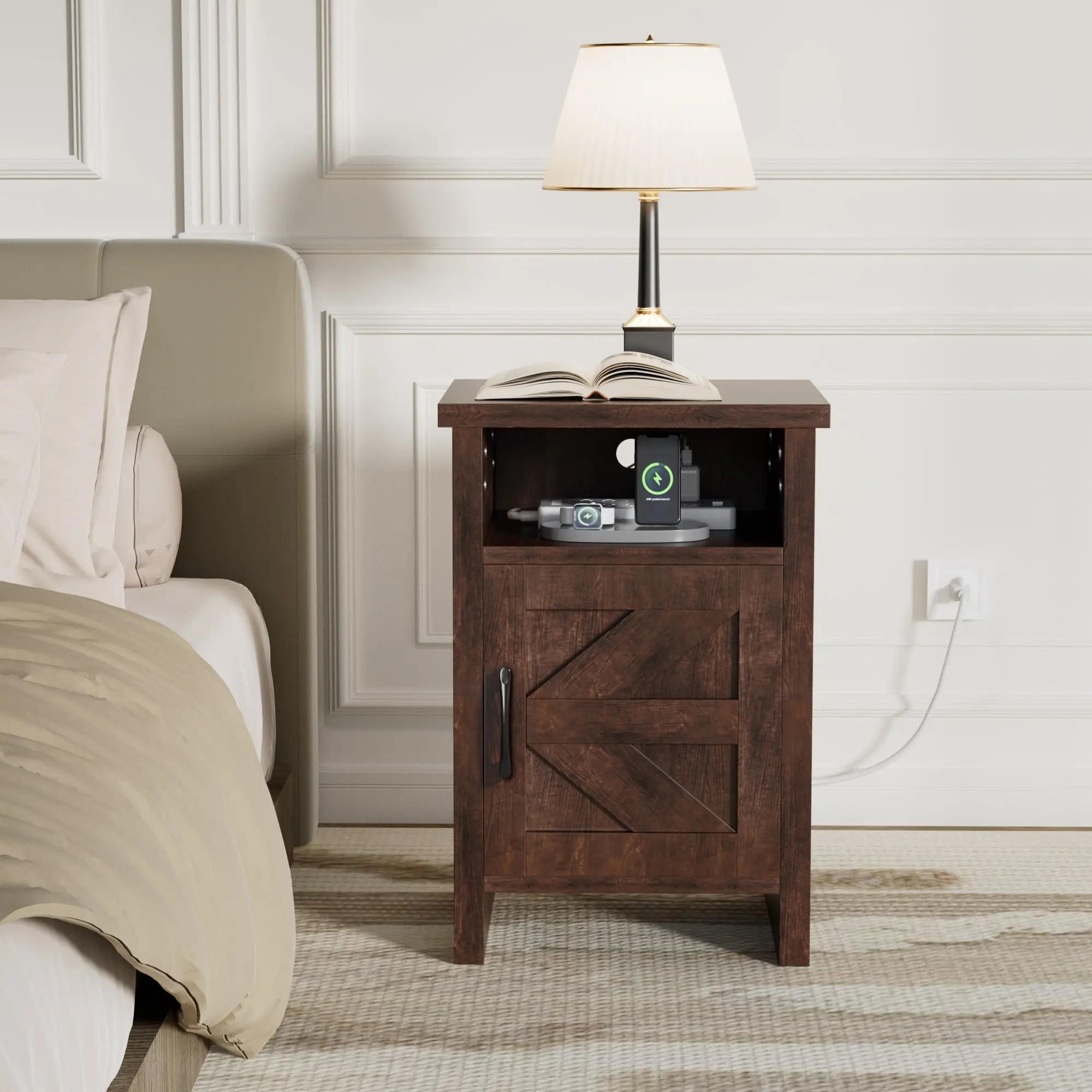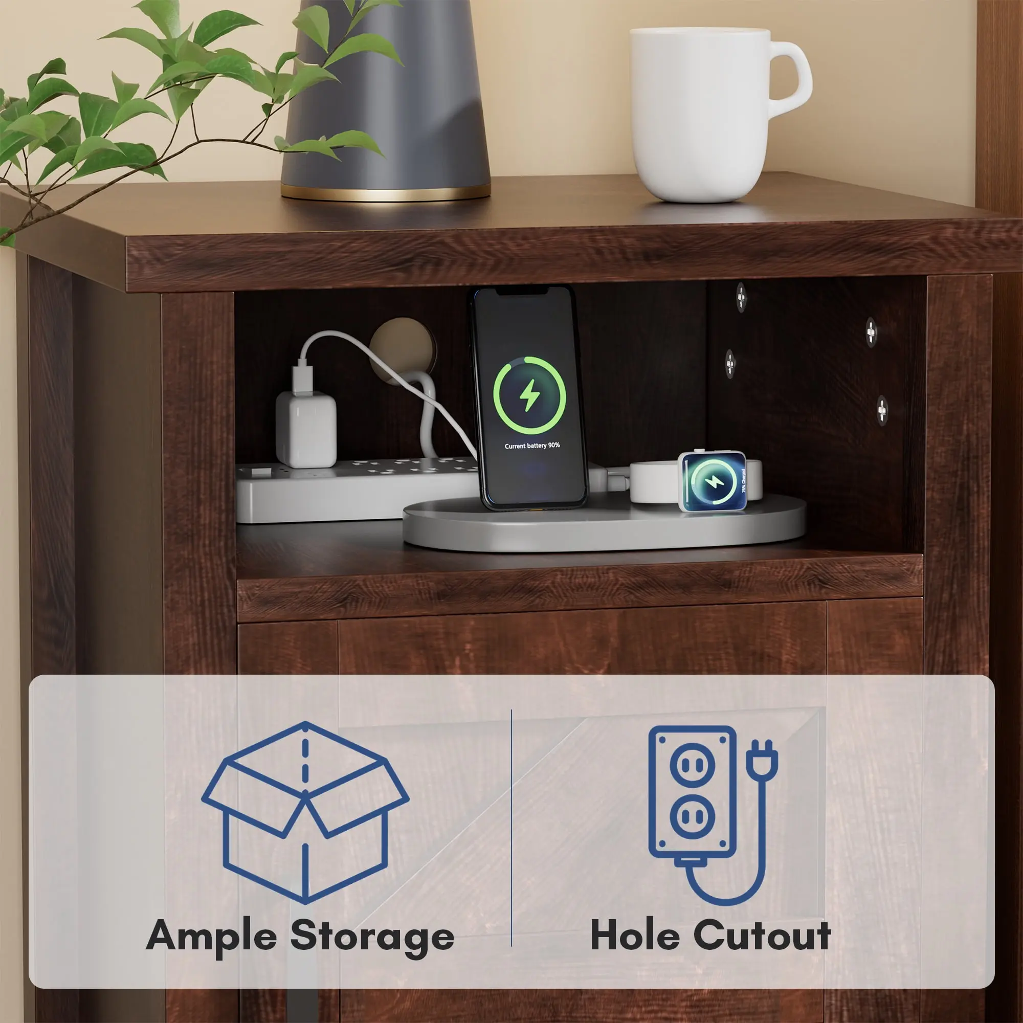·【Intimate design】: Slippers can be placed at the bottom of the bedside table, perfect use of every inch of space. Nightstands are equipped with holes to fit sockets into the first level, which can charge your electronics.