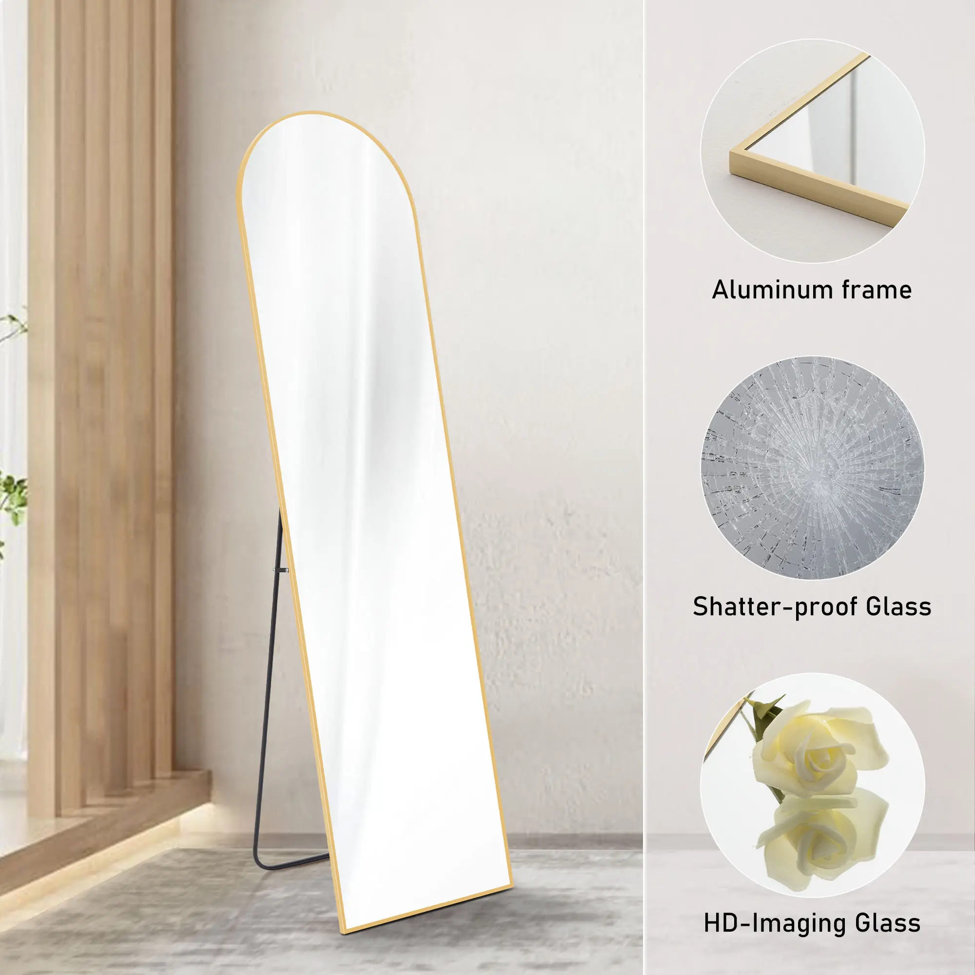 • Explosion-proof Glass: Our arched full-length mirror is made of high-quality explosion-proof film. When shattered, the broken pieces won't scatter, ensuring safety for you and your children. It features anti-rust, anti-moisture, and anti-oxidation properties, making it durable.