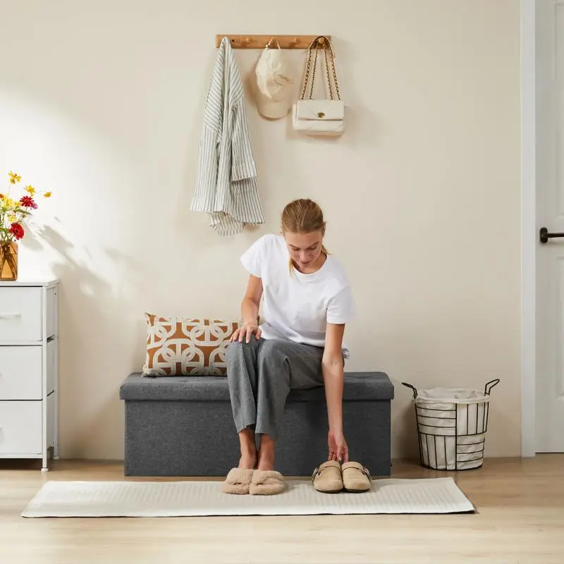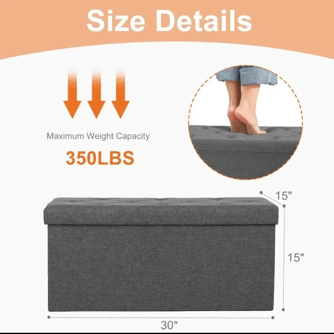 [Comfortable & Durable] The entire surface of thisstorage ottoman bench is covered with linen fabric andthe top is filled with high-density foam to ensure it is softand comfortable.The ottoman stoolis supportedthroughout by a thick MDF board, giving it a static loadcapacity of up to 660 lbs.