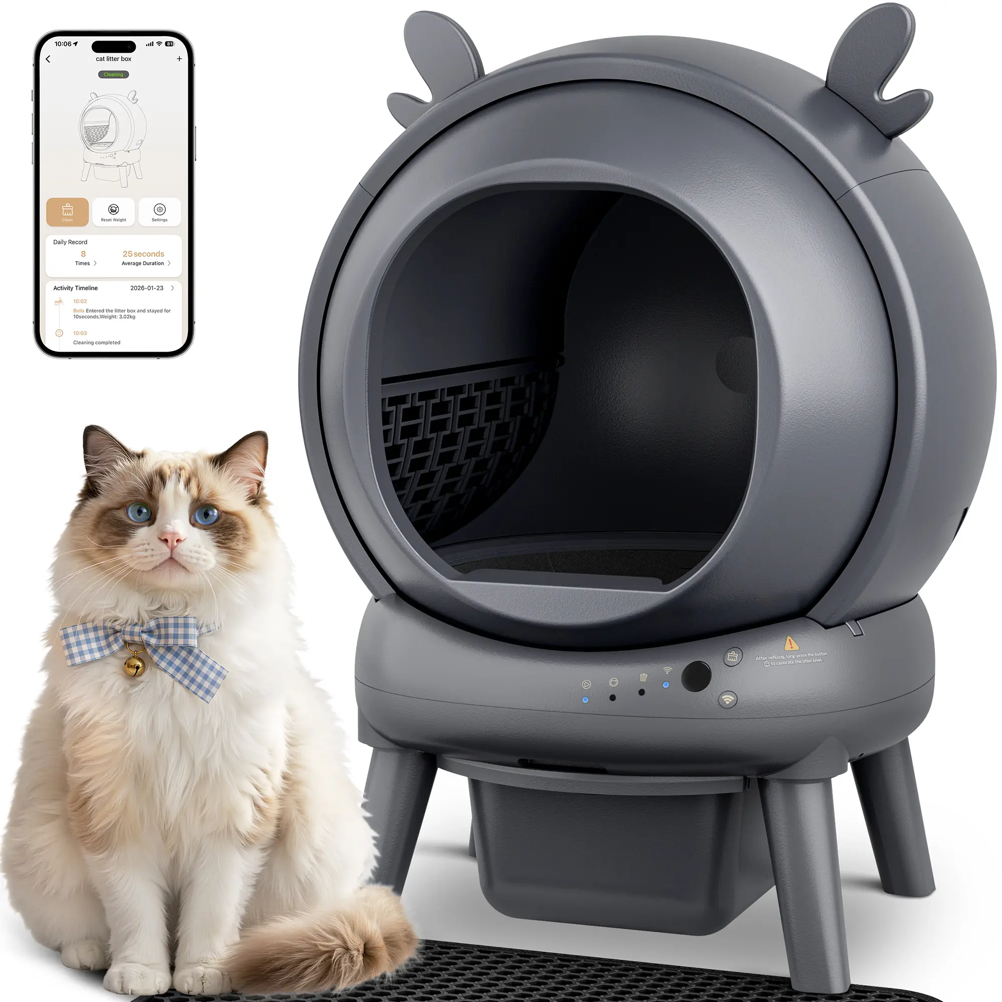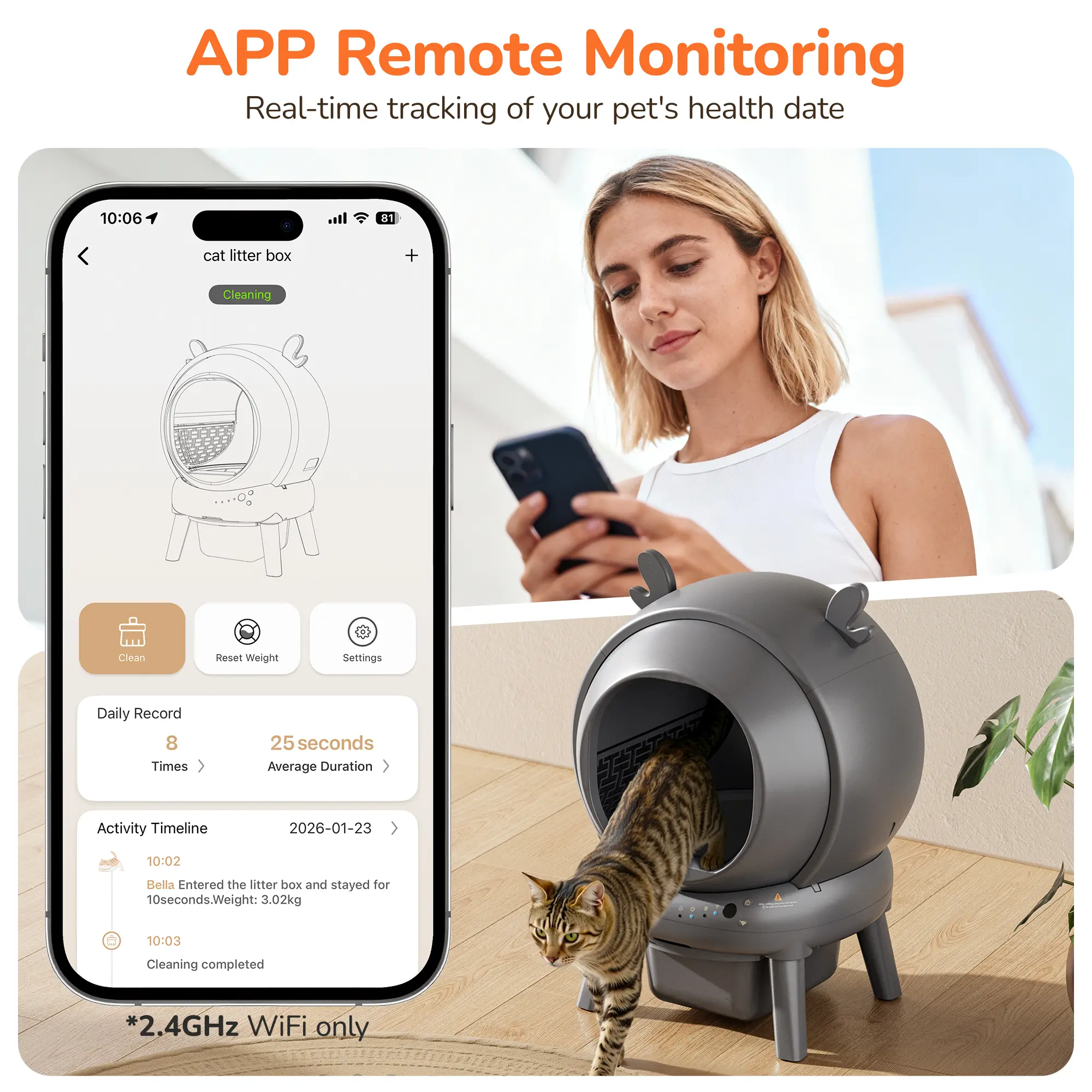 ·【Smart App Control & Health Tracking】Connect easily with the Smart Life app for seamless one-tap control of your device. With 2.4GHz WiFi app control, you can access bathroom frequency, litter usage, and weight trends, set cleaning delays, activate sleep mode, and receive full-bin reminders. This auto litter box self cleaning gives you early insight into your cat’s health easily