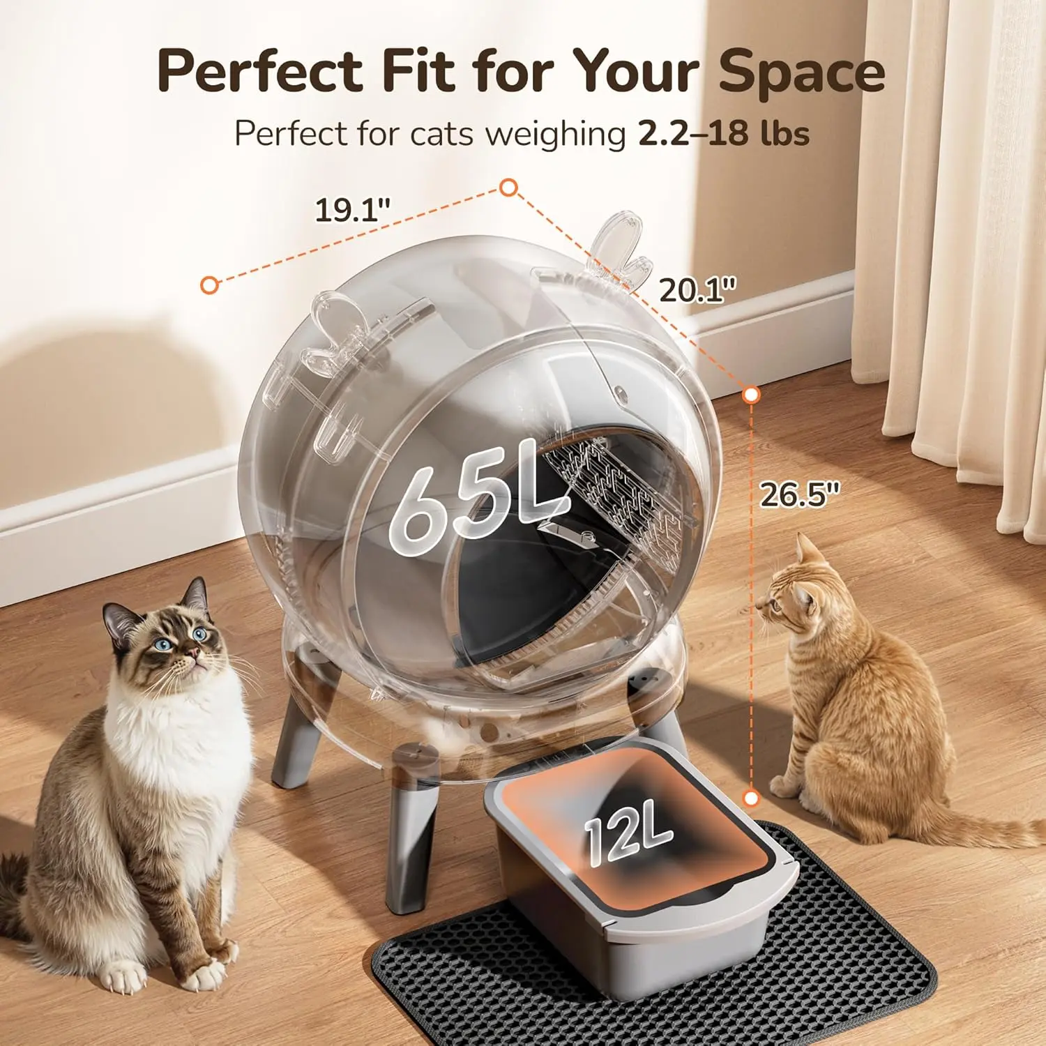·【Save 30% More Litter】This automatic cat litter box self cleaning reduces waste and saving at least 30% on litter costs. Compatible with clumping, crystal, and tofu litter. This smart litter box comes with a 65L large globe, wide entrance, fits cats from 2.2–18 lbs. Even bigger cats can turn around comfortably. It’s perfect for multi-cat households and doesn’t take up much space in the laundry room, living room, or bedroom