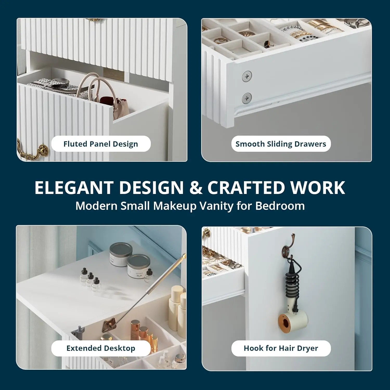 ·Solid White Finish: The vanity features a solid white color, blending seamlessly with any bedroom or powder room decor.