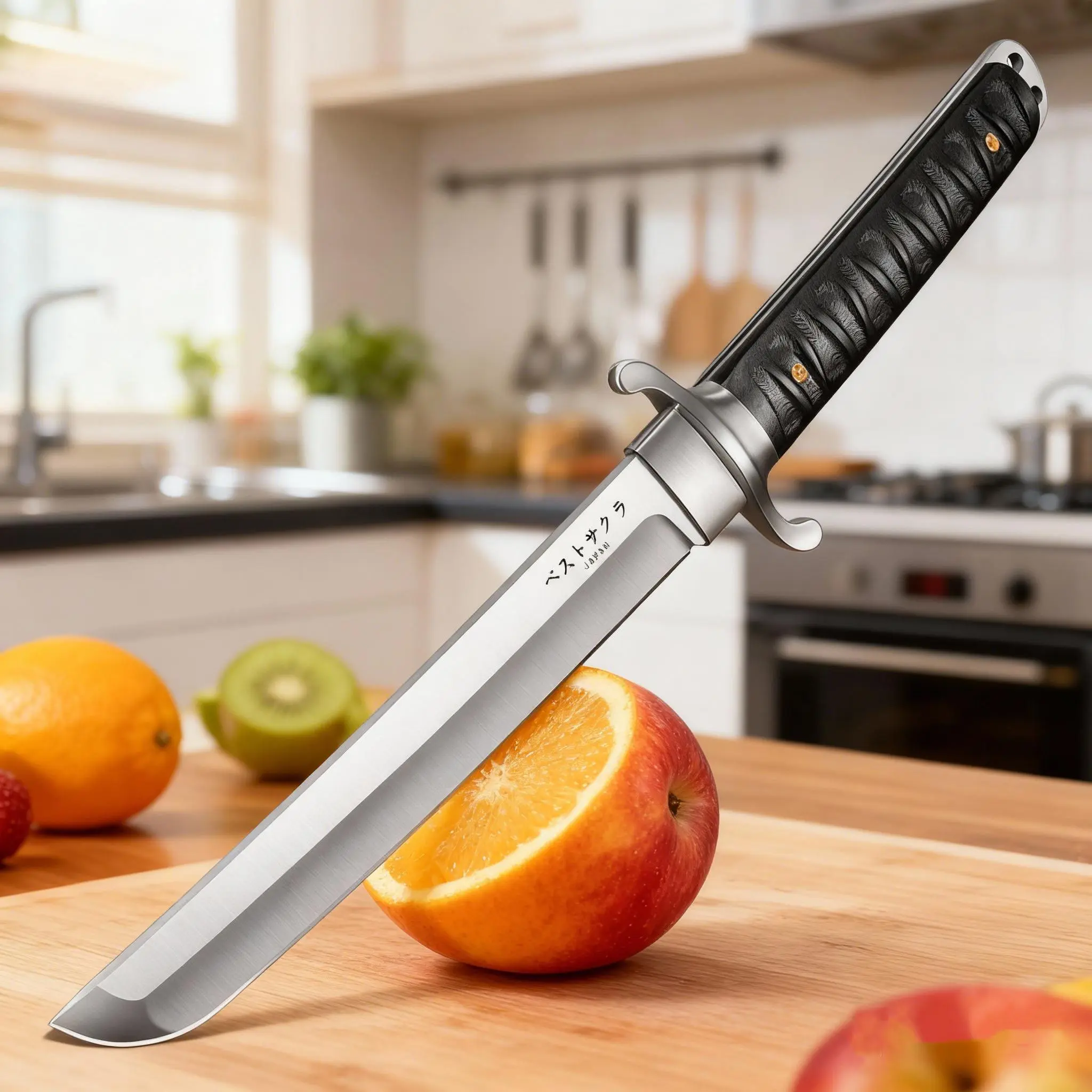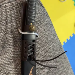 I remain impressed with this knife and it has far exceeded my expectations. It is a wooden sheath secured by leather loop for the belt. My only. The leather is not as nice as it could be. The knife is heavy, solid and well made. It is sharp and did cut paper. Mfr should find cooler Japanese.